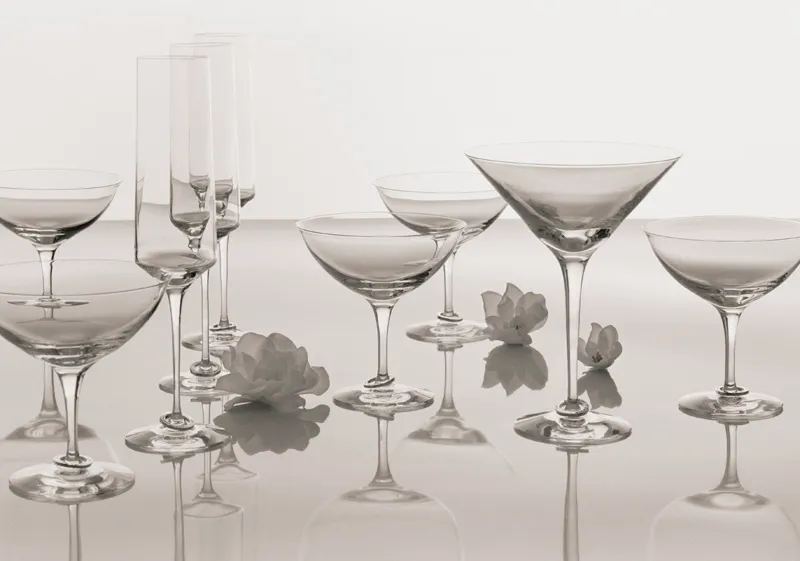 The champagne glass breaks the series’ square form factor and is distinguished by its flute …