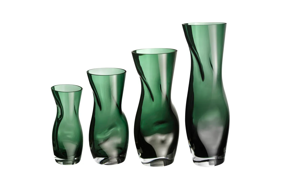 The squeezed shape of the vase shows off the bouquet to its best advantage and brings vase and flowers together in an attractive natural symbiosis. The clear, white, black and coniferous green versions are available in four different sizes, the red in two.