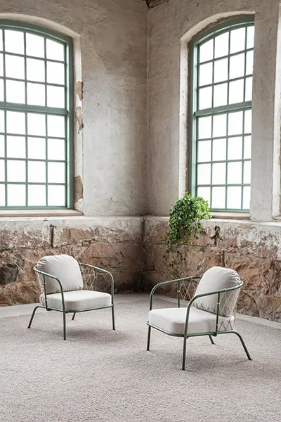 Sustainability and environmental care are central to the design and choice of materials. In Materia’s production, the back’s beautiful pattern is braided by hand using hemp strings. The seat and back cushions are padded with hairlok, which is a mixture of horsehair and natural latex, as well as needle felt of Swedish sheep wool. For extra comfort, the Swedish sheep wool is also used as padding in the back cushion. The wood in the seat is FSC® labelled and the frame with recycled steel is available in Colours by Materia (CbM*). Yarn easy chair is suitable for many different spaces, such as hotels, lounge areas and offices. The armchair and easy chair are also excellent choices when environmentally friendly furniture is a requirement.
