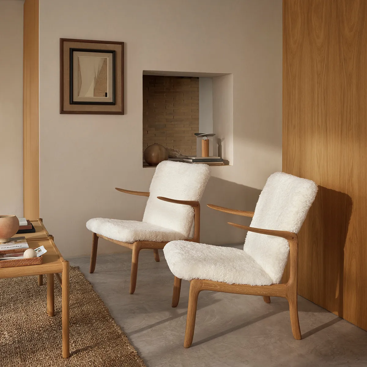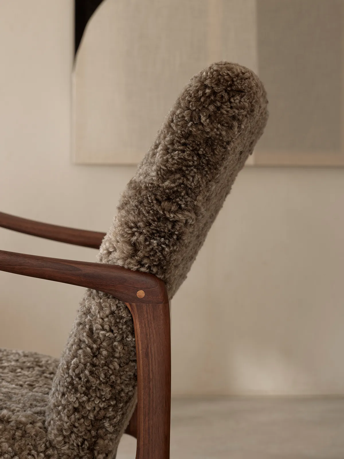The natural sheepskin creates inviting comfort while highlighting the chair’s elegant proportions and refined woodwork.