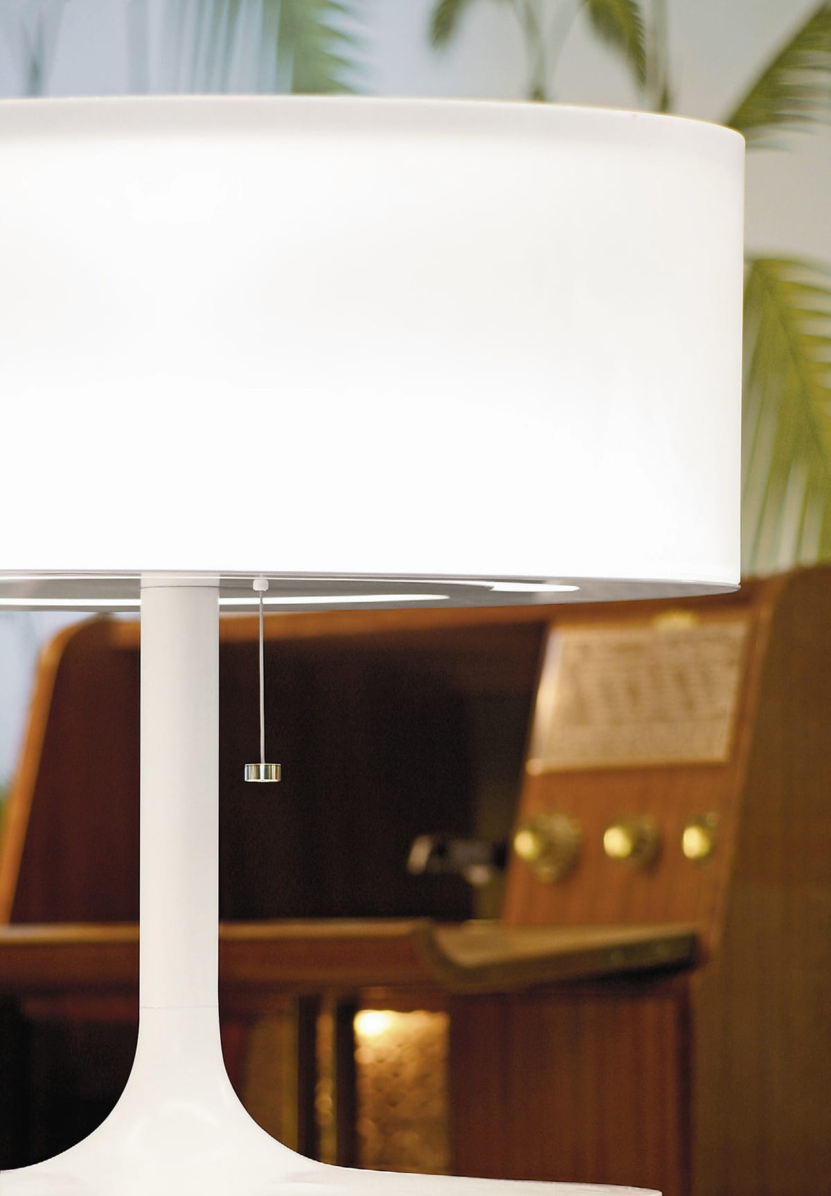 The cable is stored on a smart and tasteful way in the foot plate and the pull switch is designed with shapes and proportions from the lamp shade.