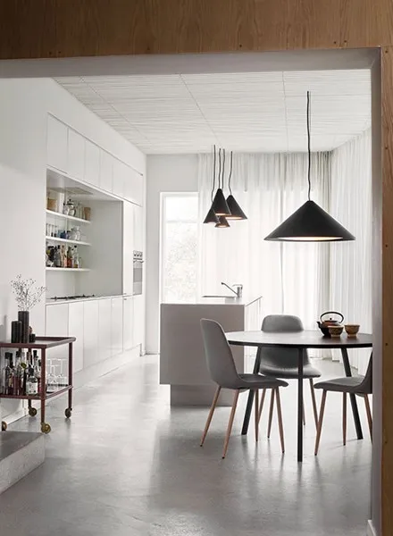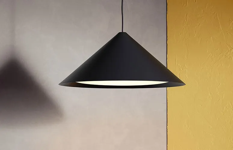 The pendants distinctive conical shades each have a curved built-in diffusormade of injectionmoulded PC. This ensures a both attractive and glare-free downward light. Each version of the shade provides its own diffusion of light while the white inner side ensures that its light is reflected flawlessly.