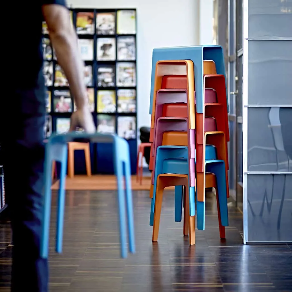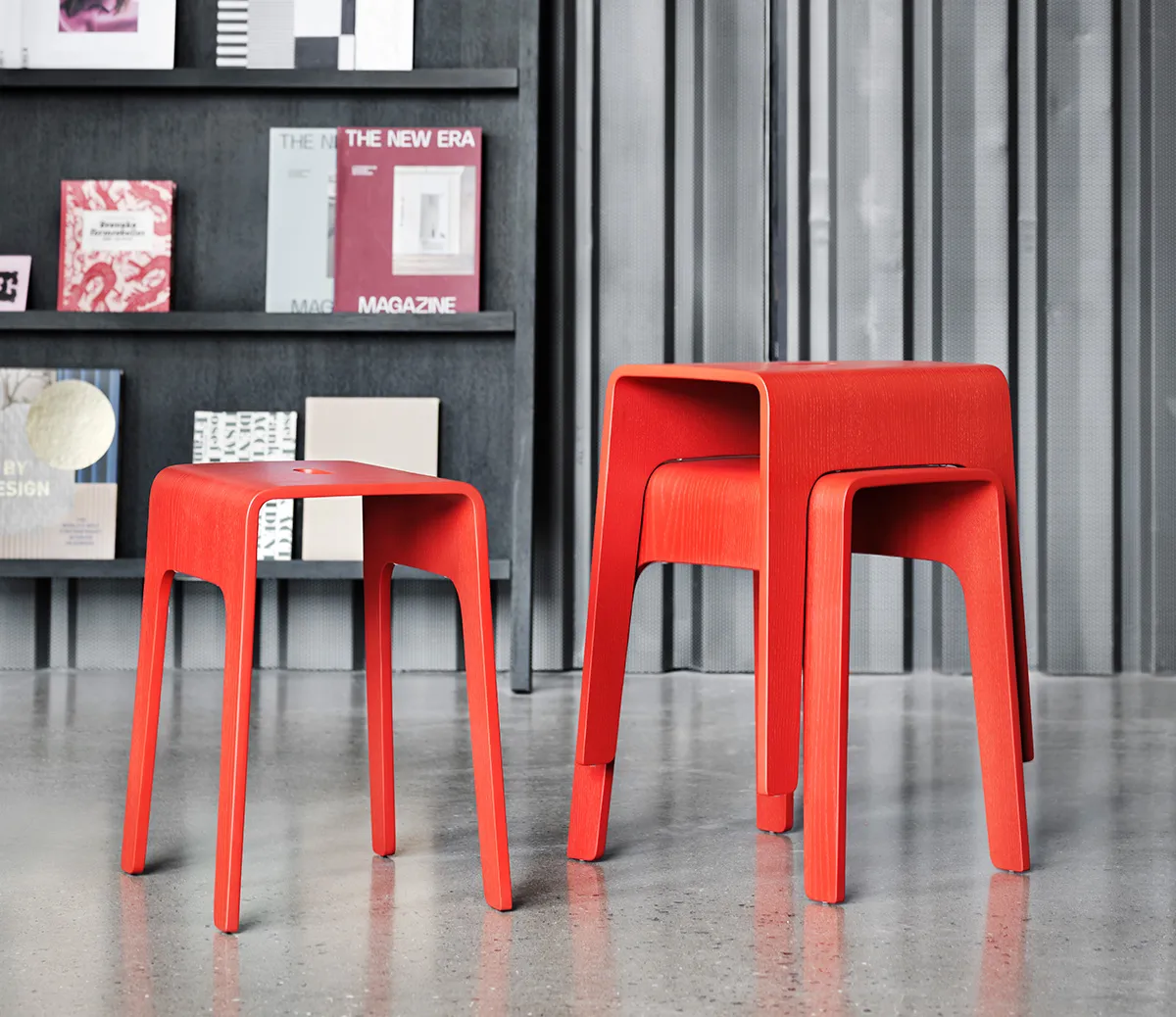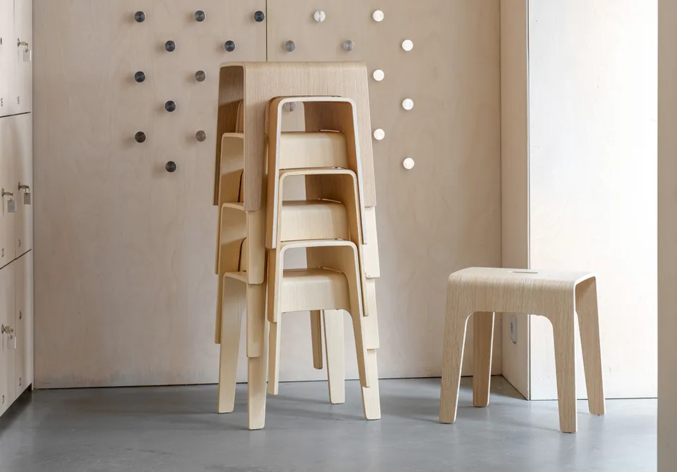 Congratulations and thanks for 30 active years in the name of service and we know there will be many more to come! Bimbo is a stackable stool made of compression moulded wood. A cut out hole as a handle makes the stool easy to move around. Bimbo can be used almost anywhere one needs a temporary little place to sit or something to balance a foot on when one can ́t quite reach and, of course, as a movable small table.