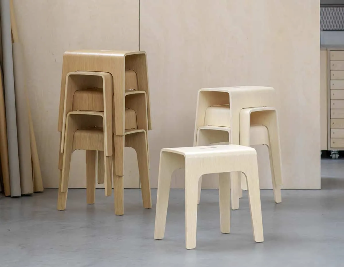 Launched in 1994 Bimbo was directly awarded with the Forsnäs Prize and is now is turning 25 in 2019. Since the launch, Bimbo has received several awards, among them the Golden Chair as Best Classic in 2005, then only 11 years old. Bimbo is just as popular now as it was when it was launched, a true classic now being celebrated with new walnut and ash veneer surfaces. The original is made of compression-moulded birch wood with a birch or oak veneer finish. The cut-out on the seat makes it easy to move Bimbo around and use wherever it is needed, for sitting or reaching awkward places. Its graphic form can be stacked seamlessly to create a beautiful tower in the room where it is being stored.