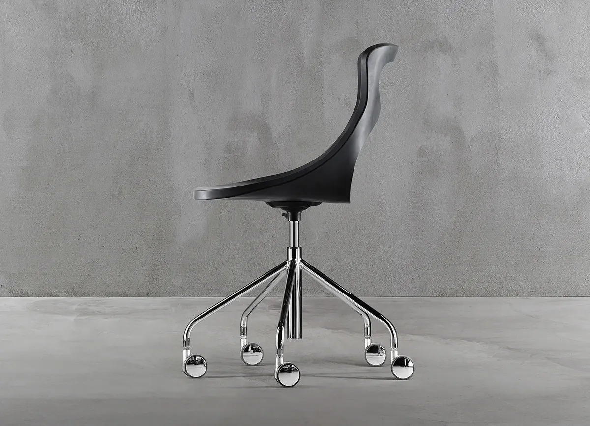 The Supersonic collection embodies Dahlström’s unique design philosophy, merging his acclaimed graphic design background with three-dimensional furniture innovation. The result is a chair that speaks to both form and function, featuring a distinctive chrome-plated metal structure that serves as both aesthetic statement and ergonomic foundation.