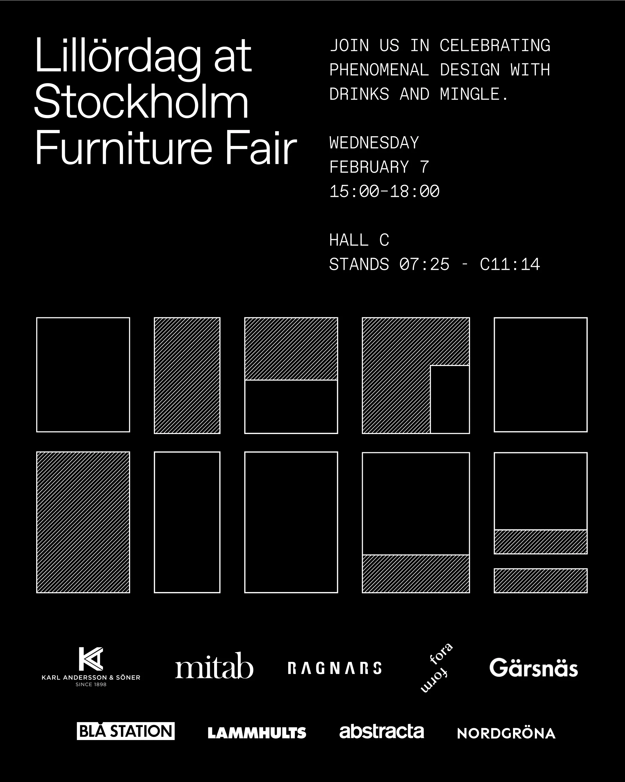 Welcome to us in Hall C on Wednesday afternoon at Stockholm Furniture Fair where we offer After Work mingling and drinks to celebrate exceptional world-class design! We call Wednesdays for the “Little Saturday” (Lillördag) in Swedish and during the fair this is especially true with extra festivities in Hall C. You will find Blå Station in stand C09:38 and other participants in the stands 07:25 – C11:14. Hope to see you in the crowd!