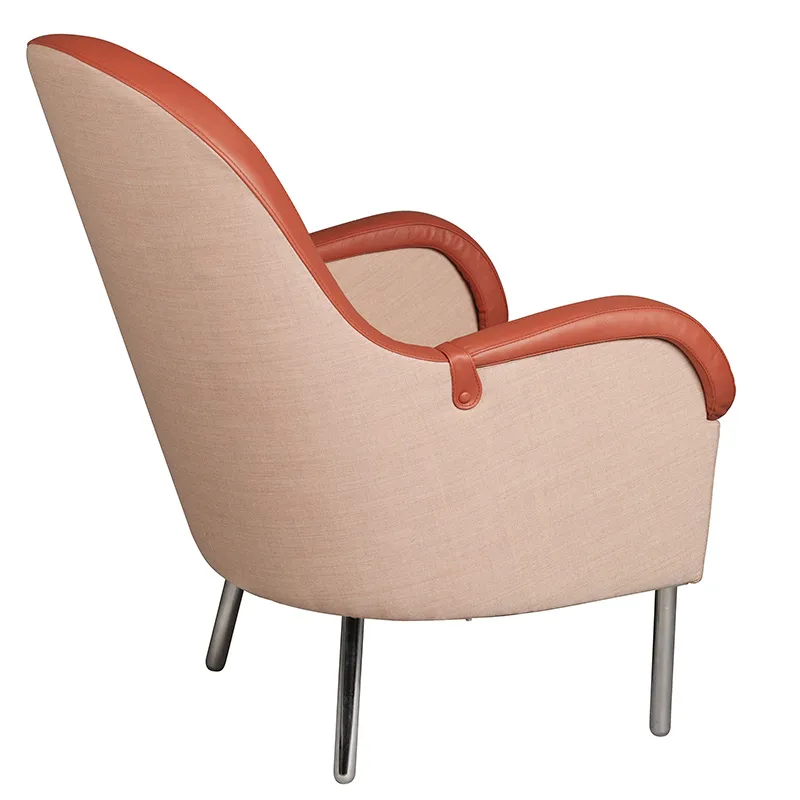 Molded wood frame, chromed steel legs. armrest. In leather. Upholstered in leather or fabric.