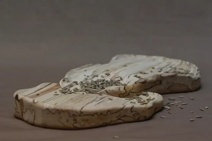 Naturen, og dens forfall, står sentralt i Årets kunsthåndverk, men gjennom bearbeiding av det råtnende materialet fremstår det som noe vakkert, dekorativt og taktilt. Fatene Innåt – som betyr noe som ligger inntil hverandre på designerens gudbrandsdalsdialekt – fremkaller dessuten følelsen av noe trygt og sterkt: De to delene er separate, men støtter seg på hverandre, og maner på den måten frem følelser av trygghet og samhold i iakttakeren. Noe vi higer etter nå!