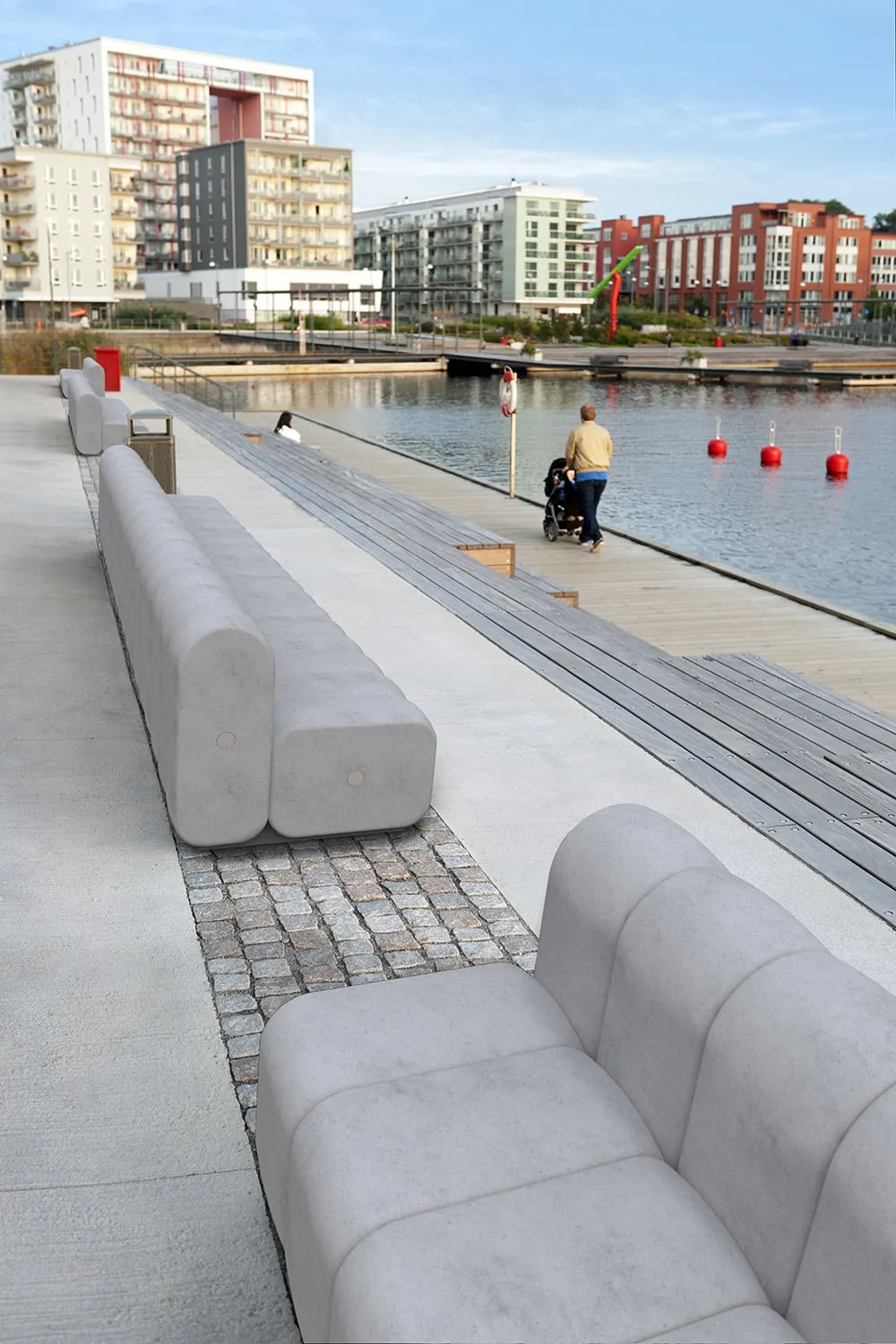 Ever since its successful launch in 2017 BOB has been waiting to go outdoors. We are proud to announce the free flowing sofa for indoor use now has been adapted to all seasons in a close collaboration between Blå Station and Starka, another family business in Skåne, which has 80 years of experience in the manufacture of concrete for special applications. The heavy-duty version called BOB Betong will furnish public spaces all around the city with generous seating for everyone.