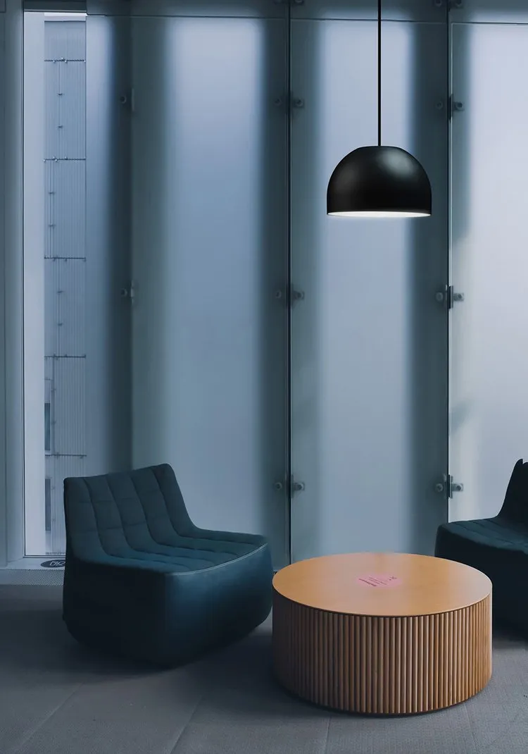 It started with a modular sofa system integrated light fixture. And the latter had the same pleasantly rounded shapes of the former.