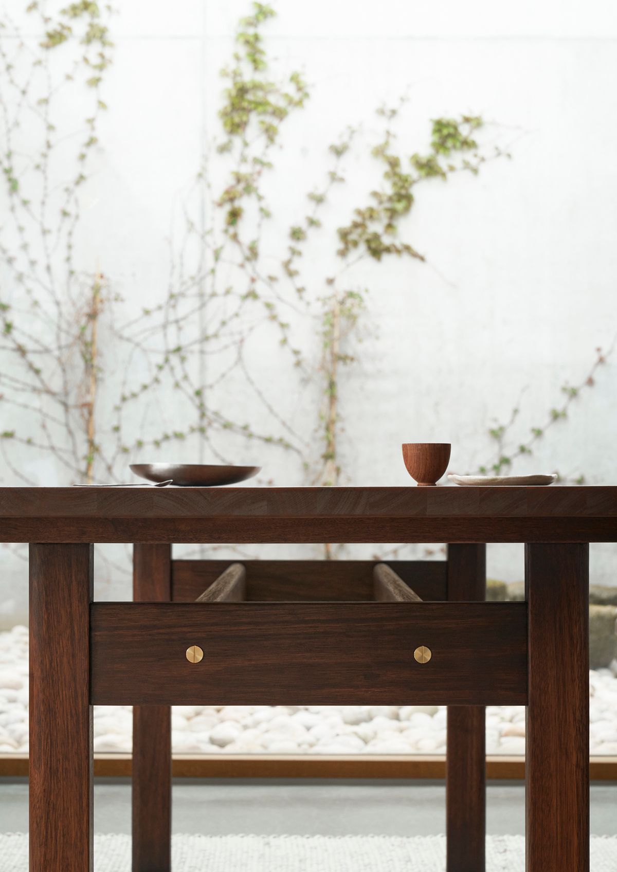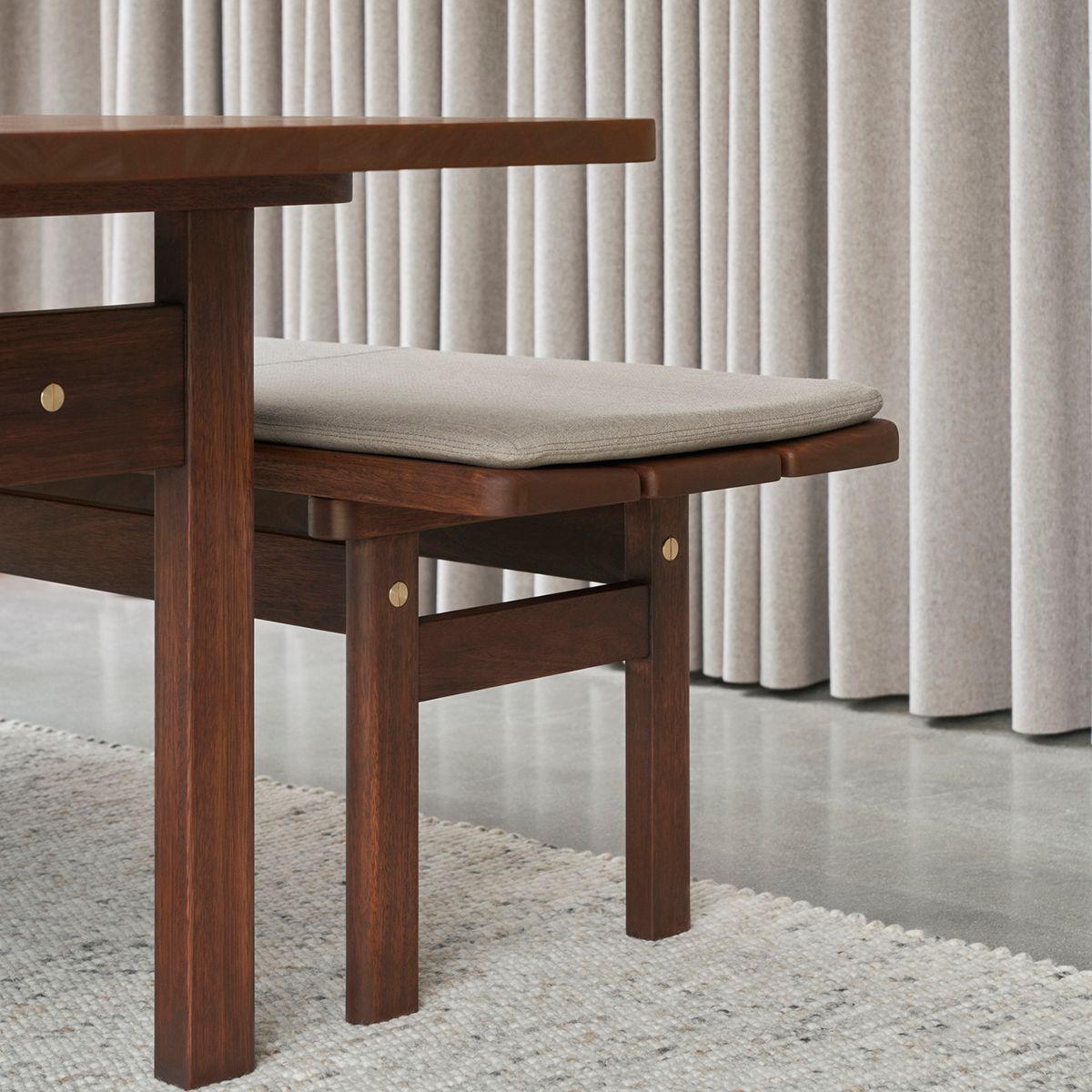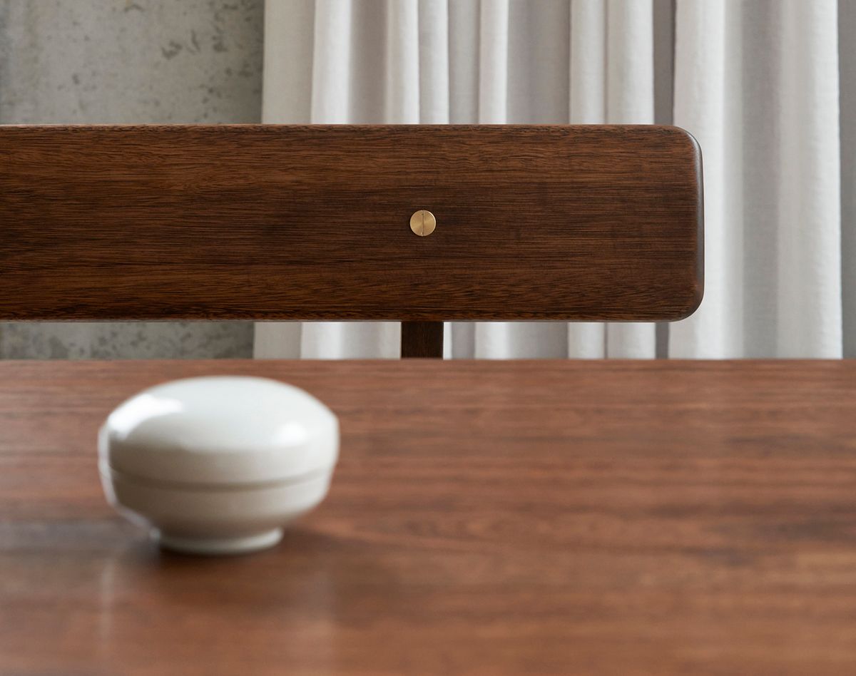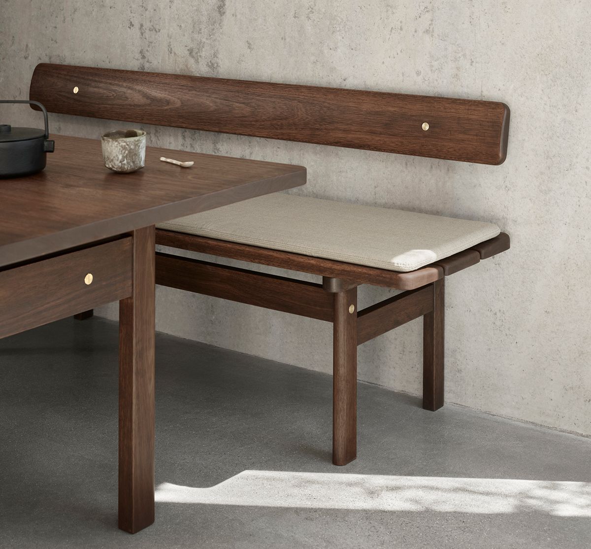 Børge Mogensen’s Asserbo Series comprises a table and bench made of solid, dark-oiled eucalyptus, and the series exudes a stringent, stylistically consistent design. The rounded shapes and visible screws of brushed brass give the series an informal aesthetic that clearly alludes to the Shaker style. The bench is available with either a permanently attached or wall-mounted backrest, as well as cushions in leather or fabric, making it possible to create a personal expression. The series was originally made of pine, but to preserve the beautiful expression of the furniture for as long as possible, the series is now made of eucalyptus, a much harder wood distinguished by its calm grains of wood, reddish-brown colour and scarcity of knots. Naturally, the wood comes from sustainably forested, fast-growing eucalyptus trees.