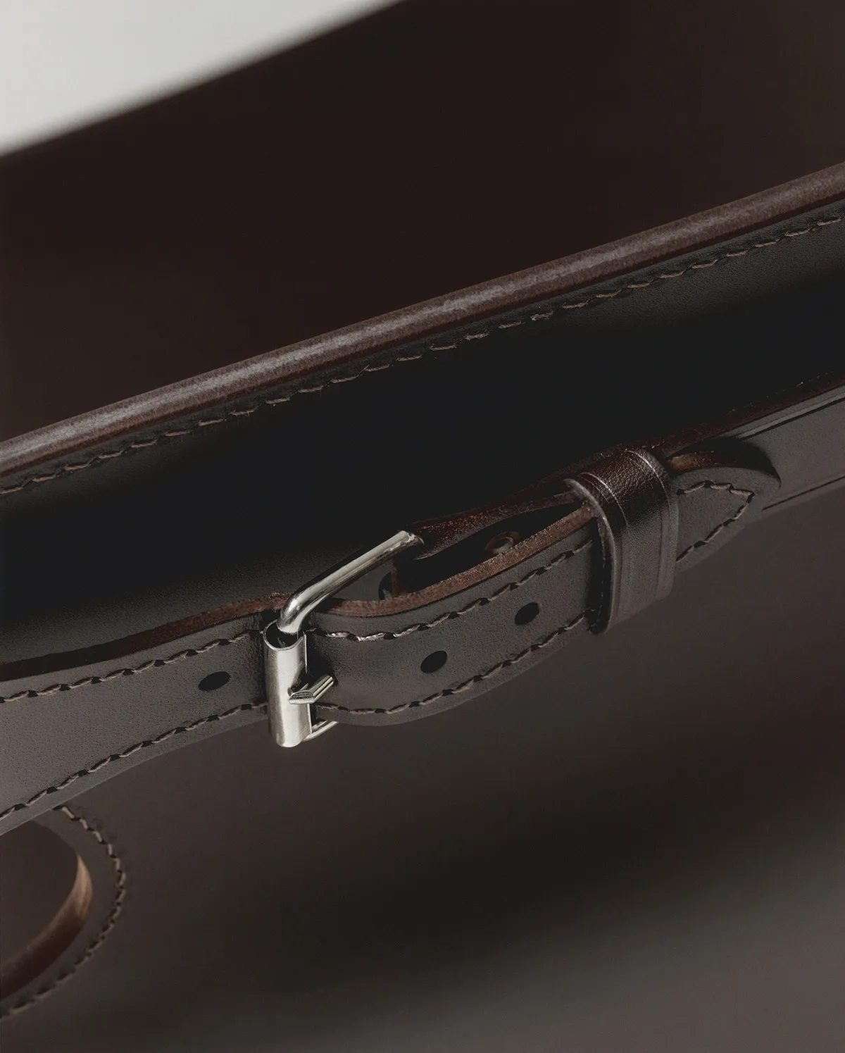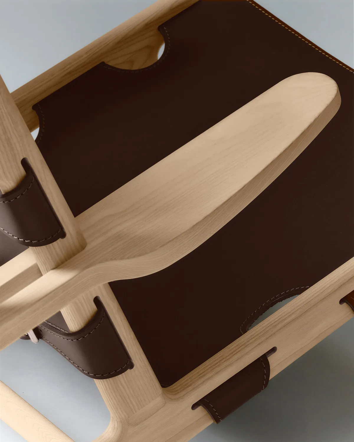 Crafted in Denmark from FSC-certified ash with a light oil finish, the chair’s natural grain is elegantly complemented by dark brown saddle leather, light brown hand-stitching, and polished chrome buckles. Each piece is fitted with a discreet steel anniversary plate engraved with Mogensen’s signature and accompanied by a certificate of authenticity signed by the craftsman who brought it to life.