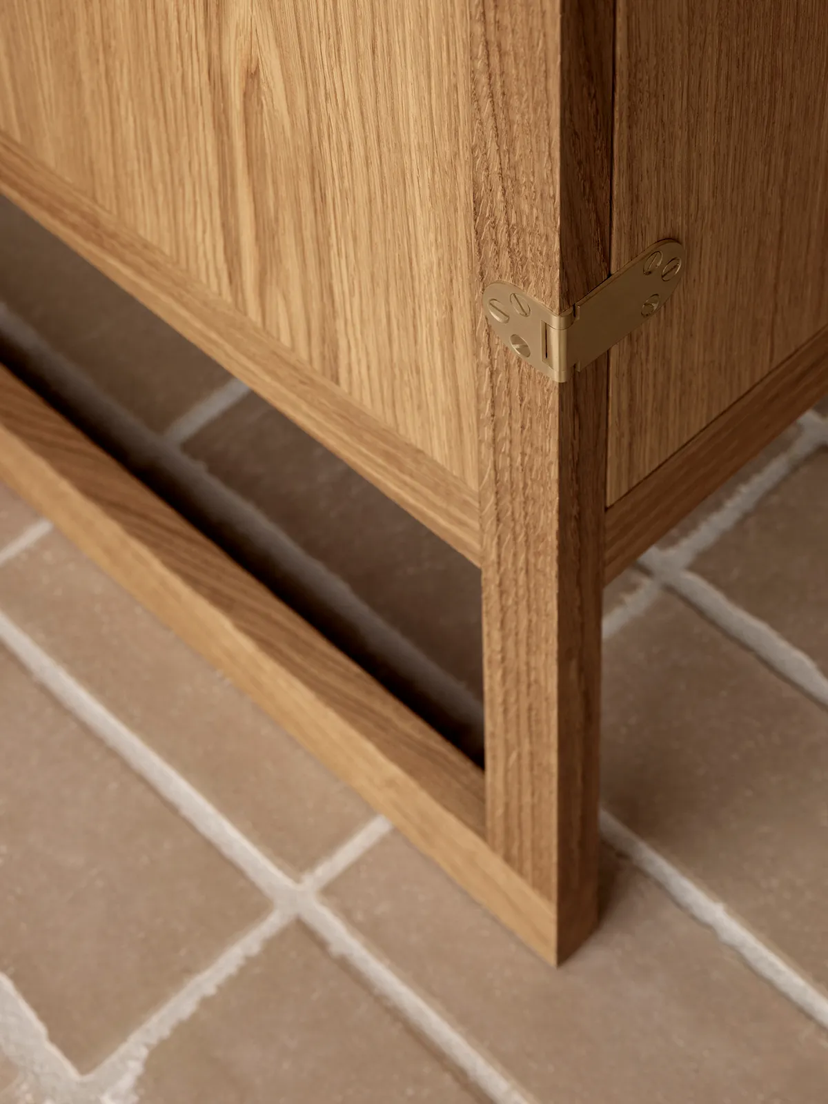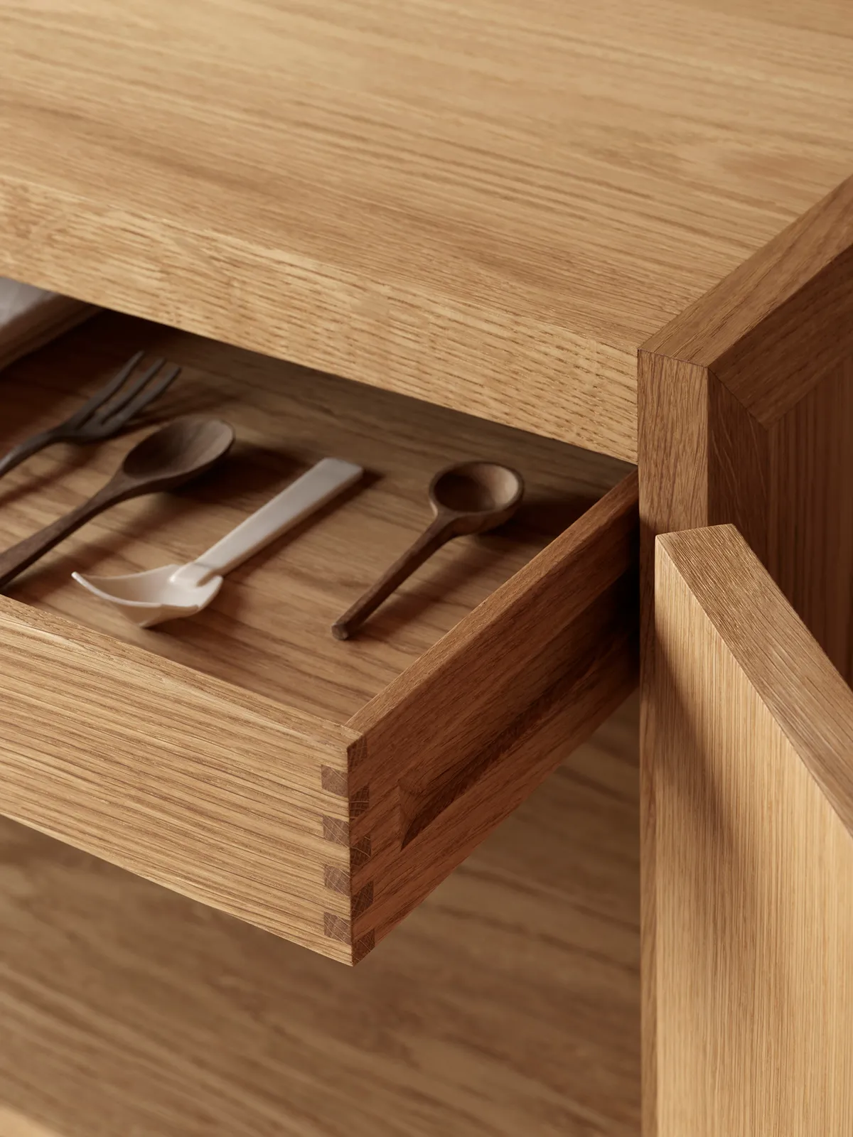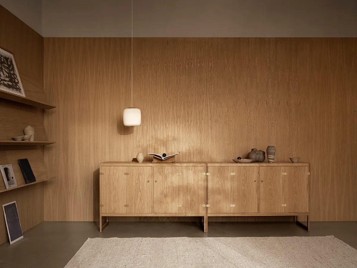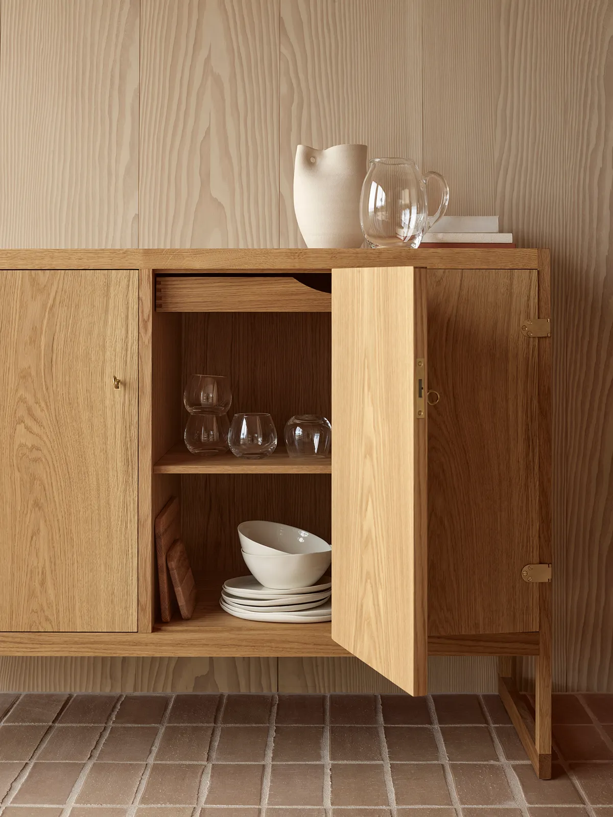 The sideboard is a complicated piece of cabinetmaking that is mastered by only the most skilled cabinetmakers at Carl Hansen & Son’s factory in Gelsted, Denmark. The sideboard is assembled by hand and requires an exacting customisation process due to its tenon-and-bevelled joints, double brackets and doors, in order to be beautiful from every angle – even from behind.