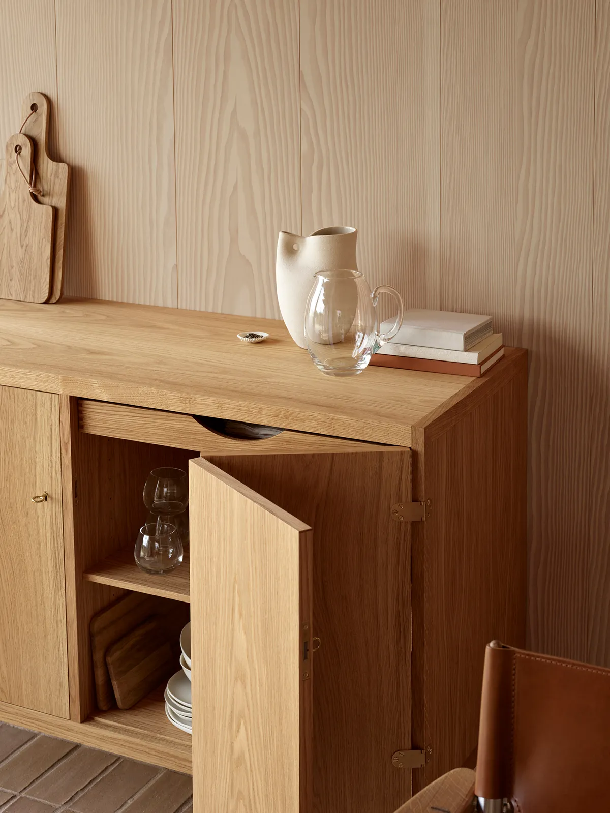 The sideboard stands out for its exclusive cabinetmaking in oak and brass; however, Børge Mogensen aimed to avoid an overly portentous style.