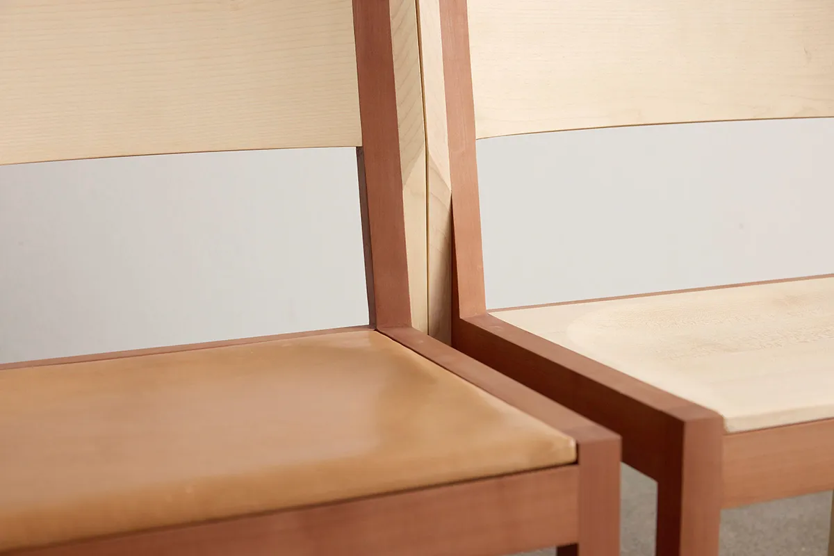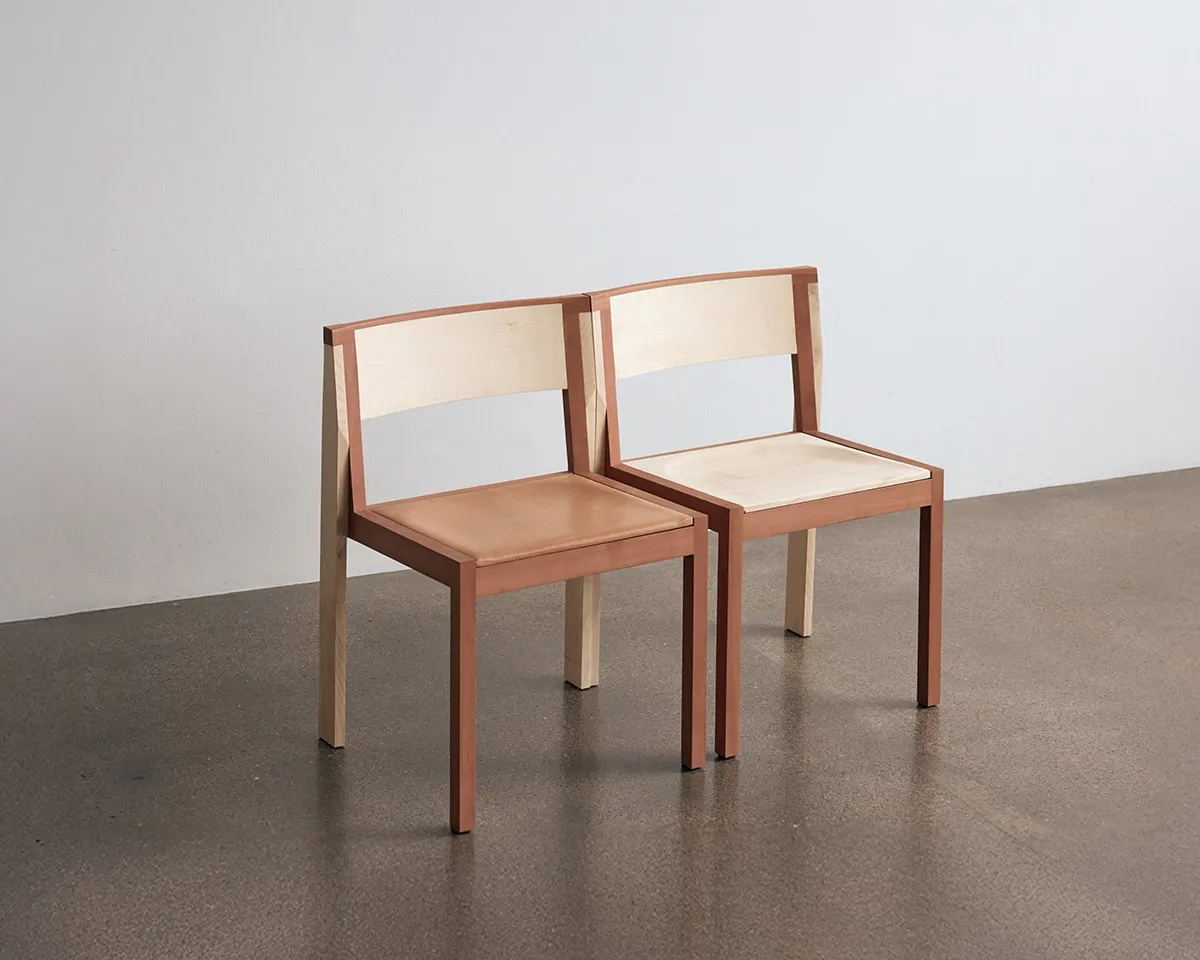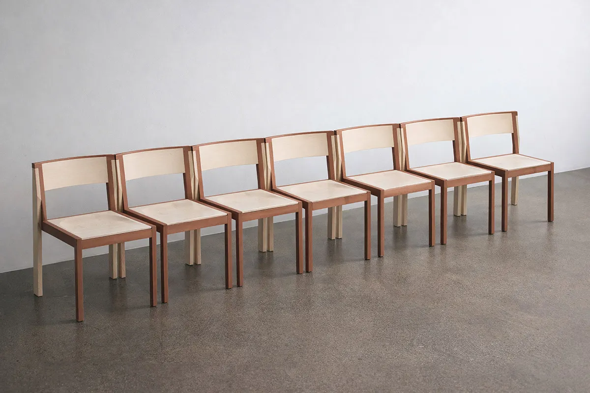 The final chair is crafted in maple and pear wood. The two species create a quiet contrast: light against warm, firm against living. Construction is visible and honest. Placed side by side, the chairs generate a rhythm; in repetition, the individual becomes part of something larger.