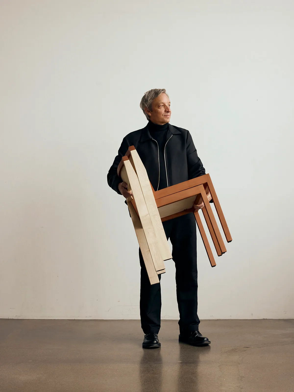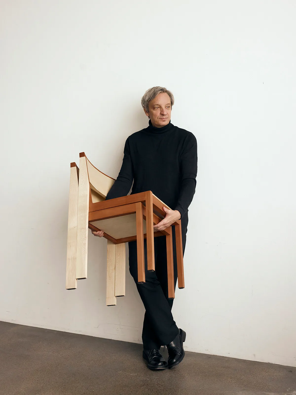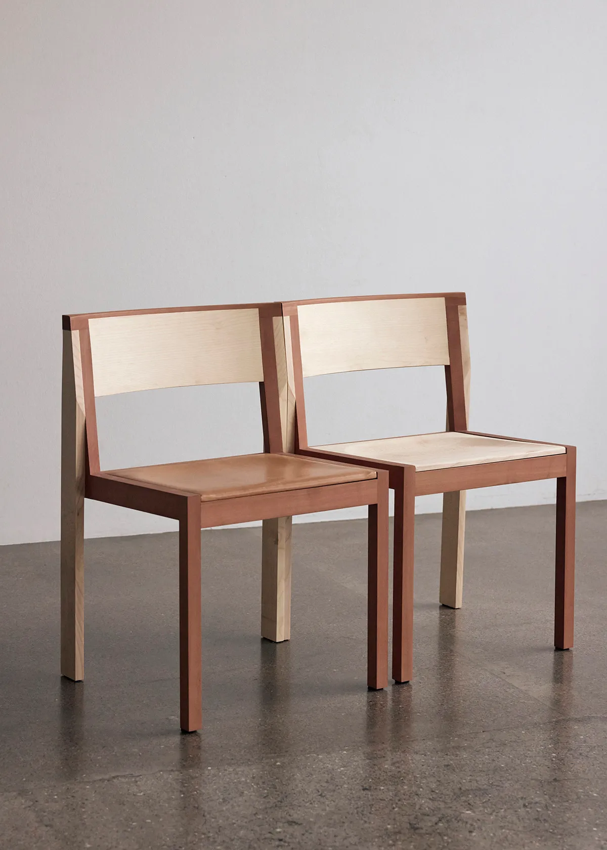 The final chair is crafted in maple and pear wood. The two species create a quiet contrast: light against warm, firm against living. Construction is visible and honest. Placed side by side, the chairs generate a rhythm; in repetition, the individual becomes part of something larger.