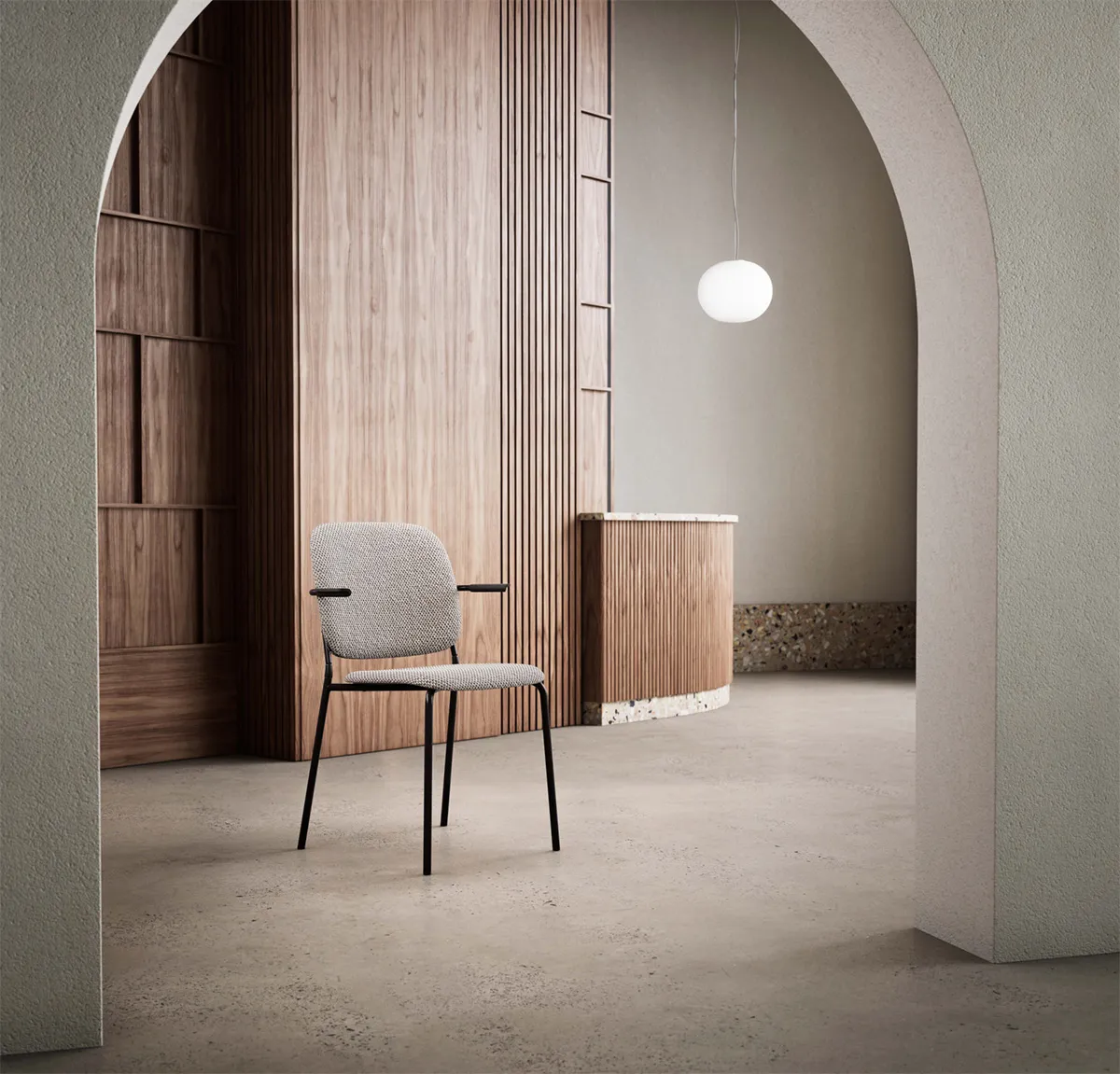 The circular and entirely separable layer-by-layer design means the piece can be renovated and updated over time. Instead of adhesive, Bow fits together using assembly sleeves, and the seat and back are attached to the frame with screws, which is unique for this type of chair. Because all parts can be replaced, it’s easy to convert Bow from a chair without armrests into a chair with armrests or vice versa. It’s also possible to reupholster the product, and it can be waste separated and recycled when it reaches the end of its life.