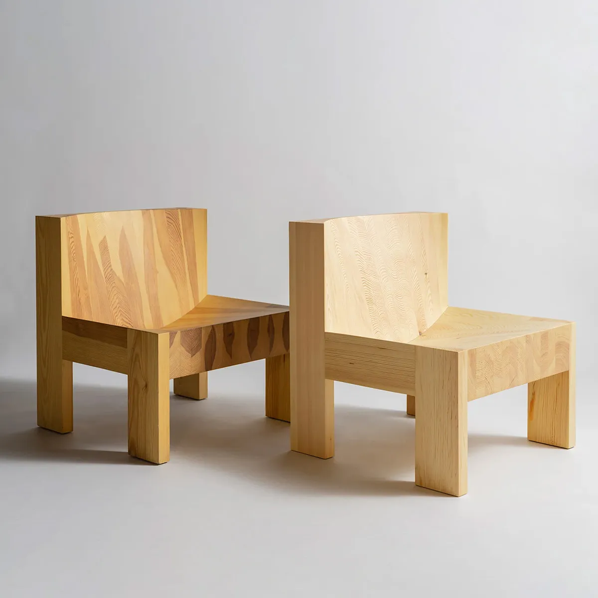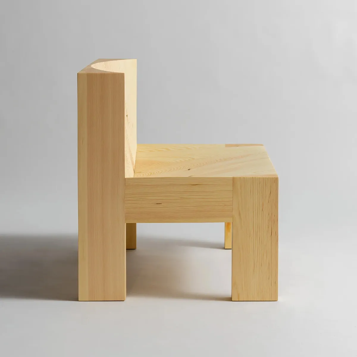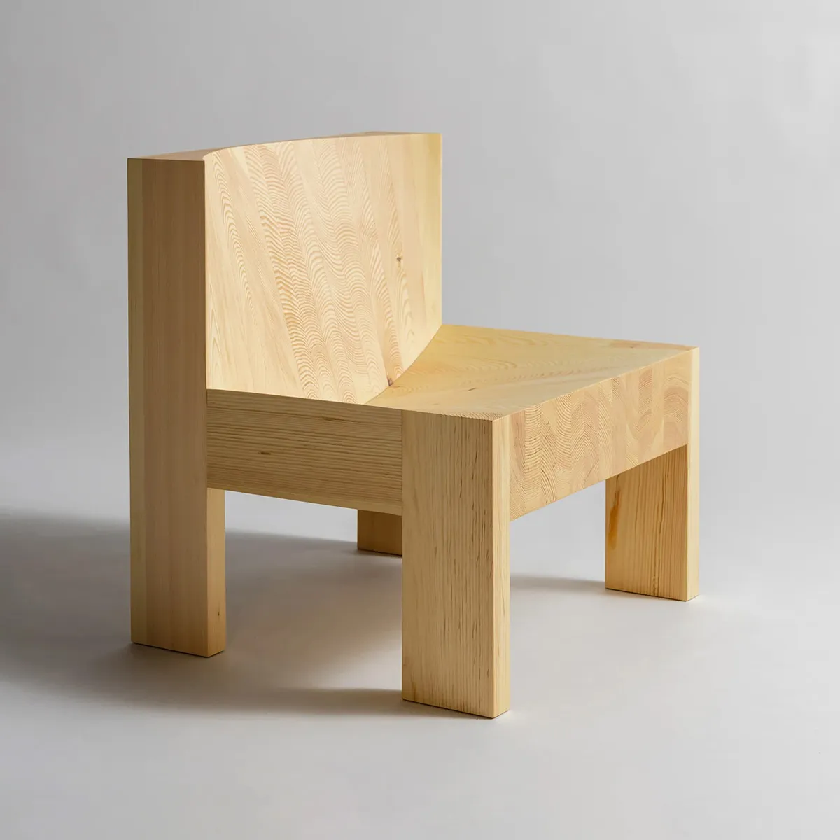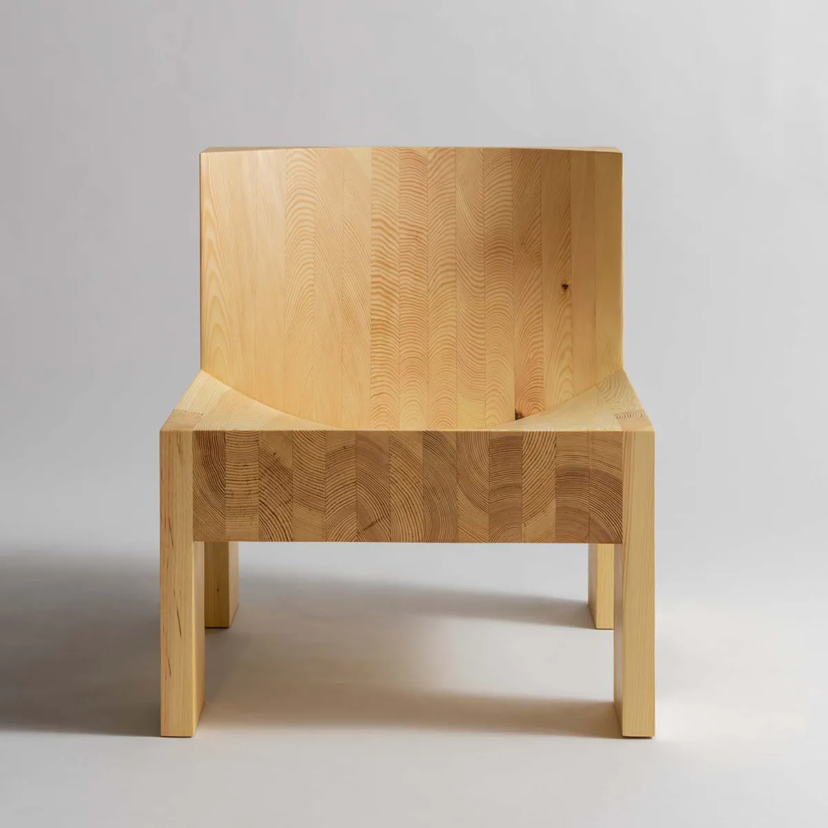 Material is scooped out of the building block-like forms to make two ample convex recesses, revealing the characterful grain within. The result is a strikingly singular chair ‘mathematical in its approach and transparent in its construction’ says Lamb.