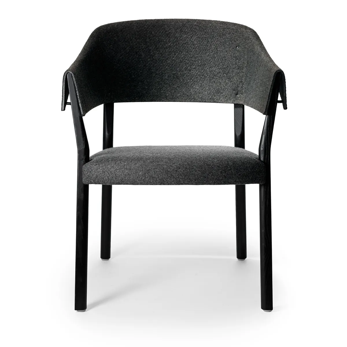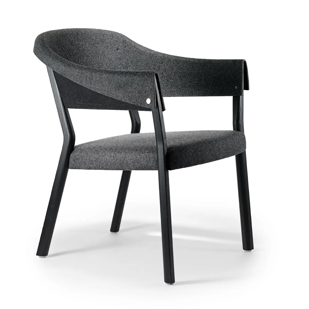 Easy chair, frame in natural ash or stain. Back and armrests in moulded felt, also available in leather. Seat covered in fabric or leather. BUTTON II, an elegant and confortable easy chair. The exciting encounter between two materials gives the easy chair a contemporary, innovative look. A easy chair for different occasions and meetings!