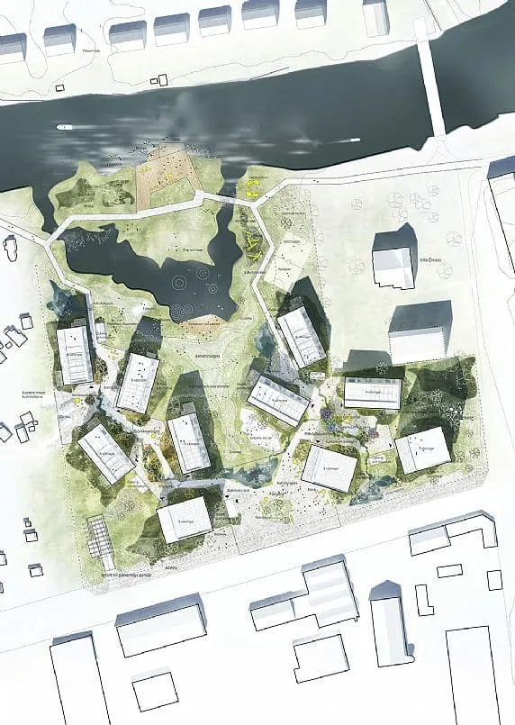 The activity route, or thoroughfare, through the area interconnects the existing promenade sections along Svartån creek with the surrounding quarter. Ängen, a generous public city park, gives the area an unexpected meeting between city and wild nature.