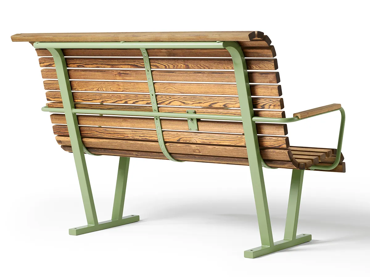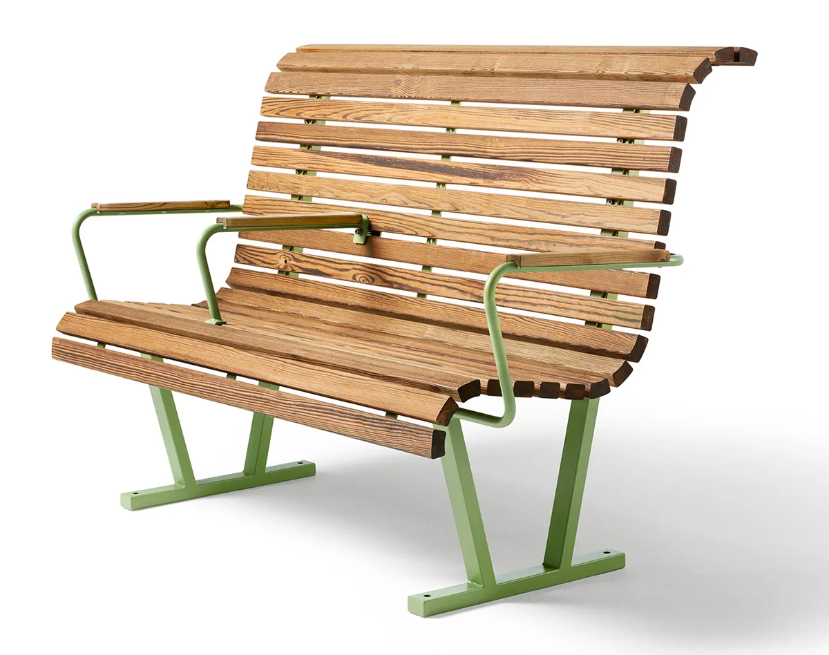 Kajen park bench Designed by Thomas Bernstrand Conventional wooden slats form the seat and backrest …