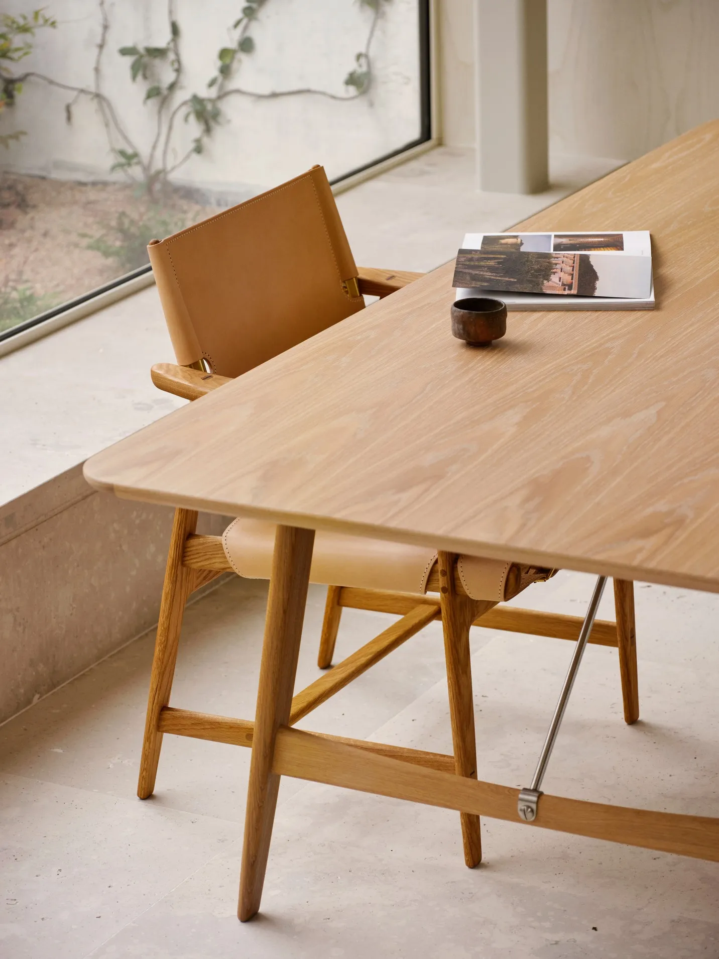The structural design of the Hunting Table comprises two solid-wood trestles with angled legs supporting a slim veneer tabletop with rounded corners and solid-wood edging. Stability is maximized by two diagonal brace bars mounted between the frame and tabletop in brass or stainless steel – a functional touch that accentuates the table’s handcrafted expression. Another refined detail is showcased in the table legs’ through-tenon joint, secured with contrasting wood wedges, meticulously hand-sanded and finished by the skilled artisans at Carl Hansen & Søn.