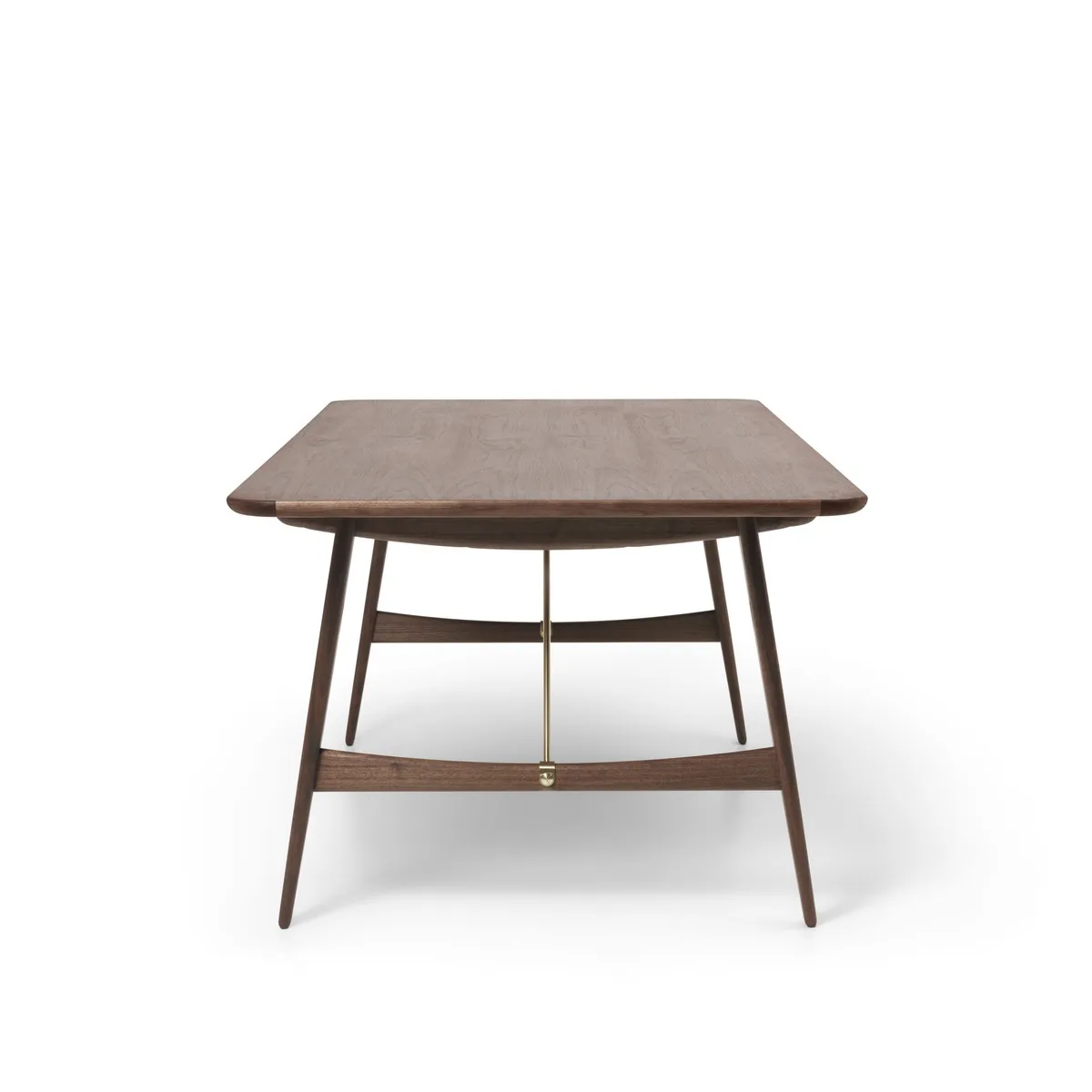 The structural design of the Hunting Table comprises two solid-wood trestles with angled legs supporting a slim veneer tabletop with rounded corners and solid-wood edging. Stability is maximized by two diagonal brace bars mounted between the frame and tabletop in brass or stainless steel – a functional touch that accentuates the table’s handcrafted expression. Another refined detail is showcased in the table legs’ through-tenon joint, secured with contrasting wood wedges, meticulously hand-sanded and finished by the skilled artisans at Carl Hansen & Søn.