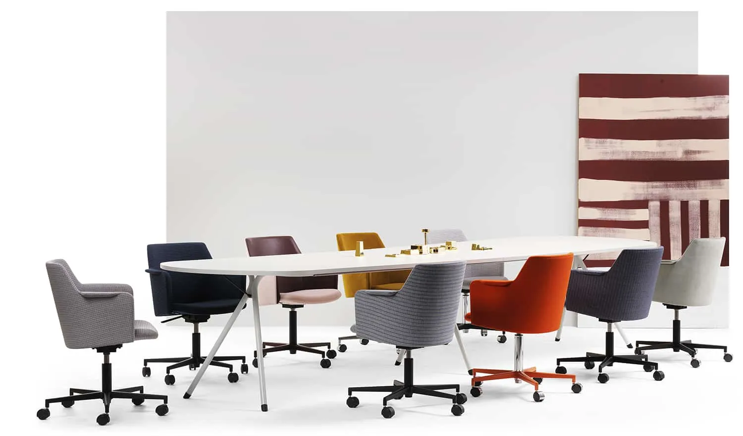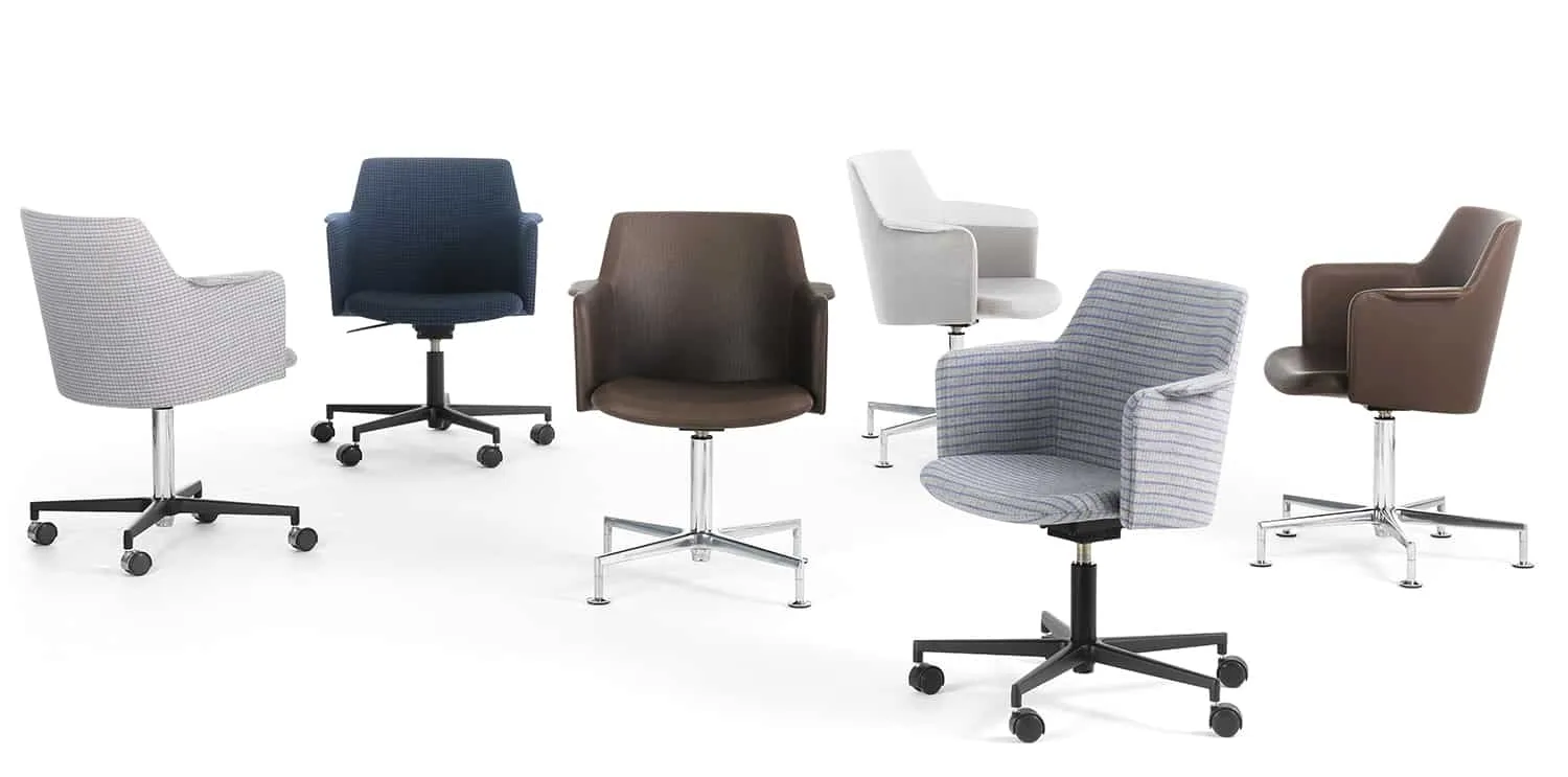 Designer Gunilla Allard’s conference chair Carousel offers maximum comfort in a reduced format. The fully upholstered shell chair has a 360° comfort tilt, which enables the seat shell to move in several directions. The result is a very soft, smooth, flexible motion for the user. As well as added comfort, the wing-shaped armrest adds character to the soft, embracing seat shell. Carousel’s swivel base comes with 4 or 5 feet in polished or powder-coated recycled aluminium, with or without casters. A height-adjustable stand is available as an optional extra on the 5-footed stand.