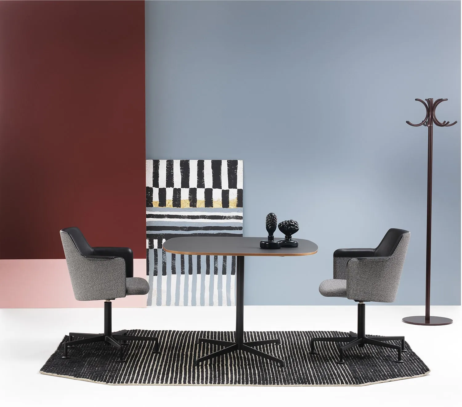 Gunilla Allard took her inspiration for the chair from the Sixties-set TV show, Mad Men. Not only the design but also the upholstery reflects this ethos, as the covering on Carousel has distinct parallels to the smart work fashions of the 1960s. The upholstery can also be tailored by combining different fabrics and leather. The permutations are endless, enabling a wide variety of looks.