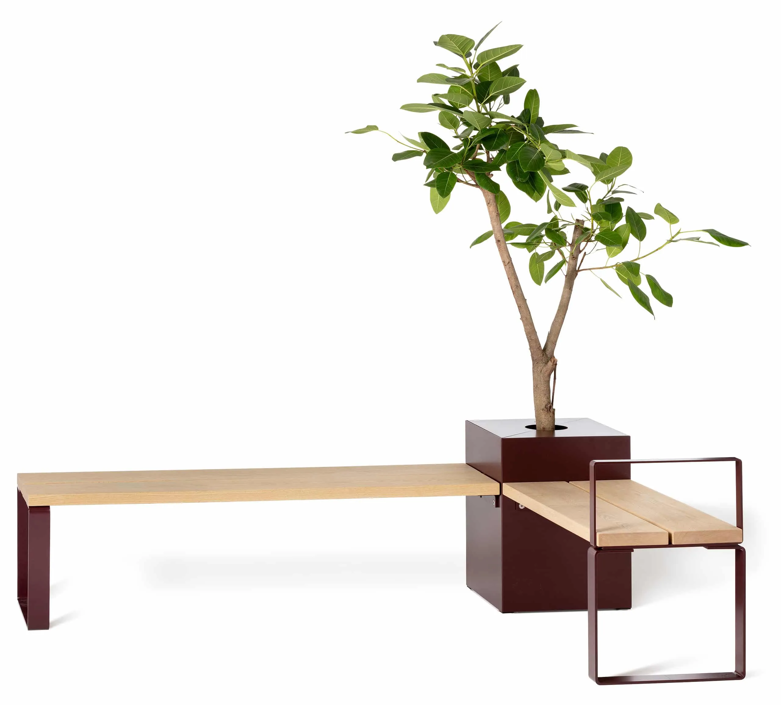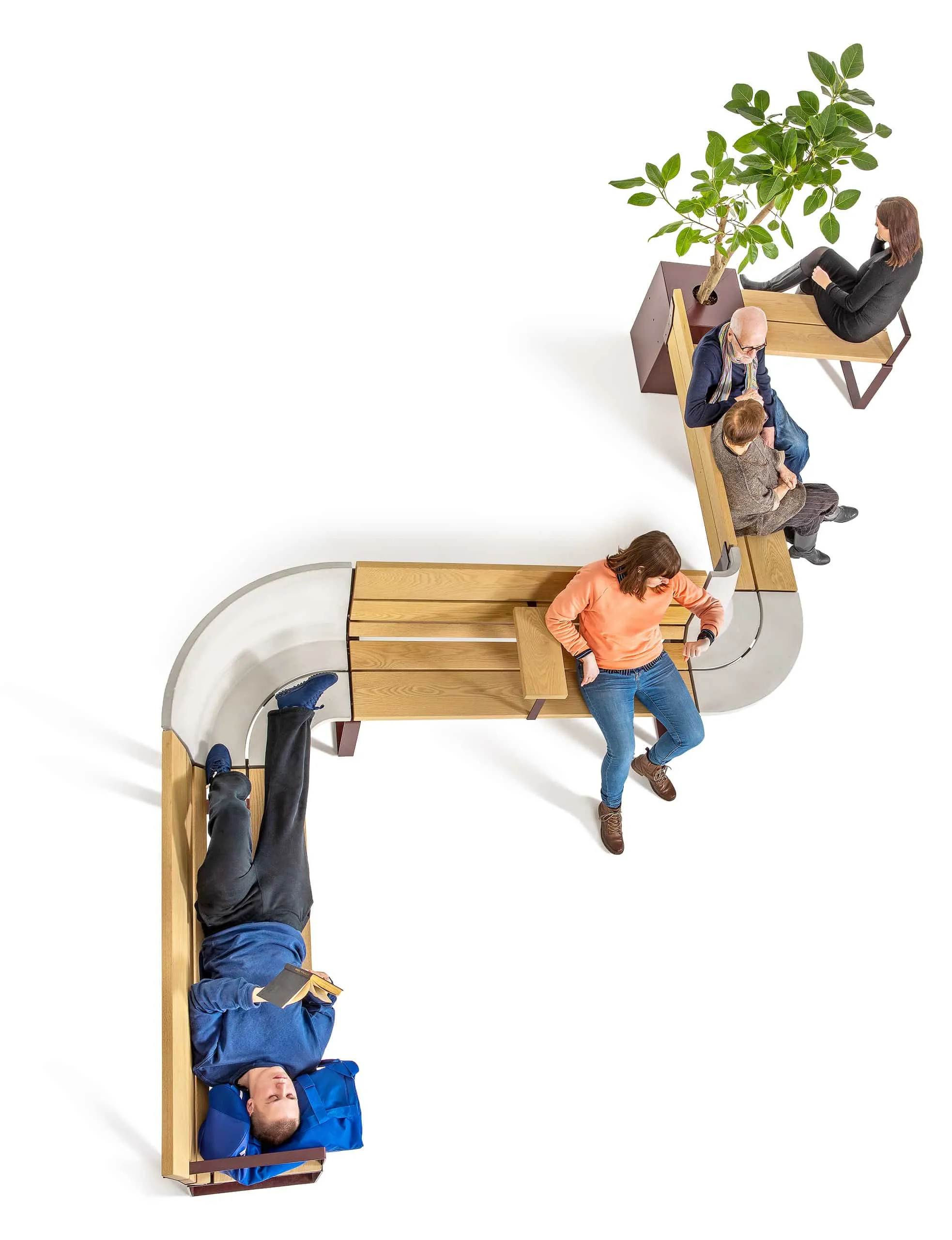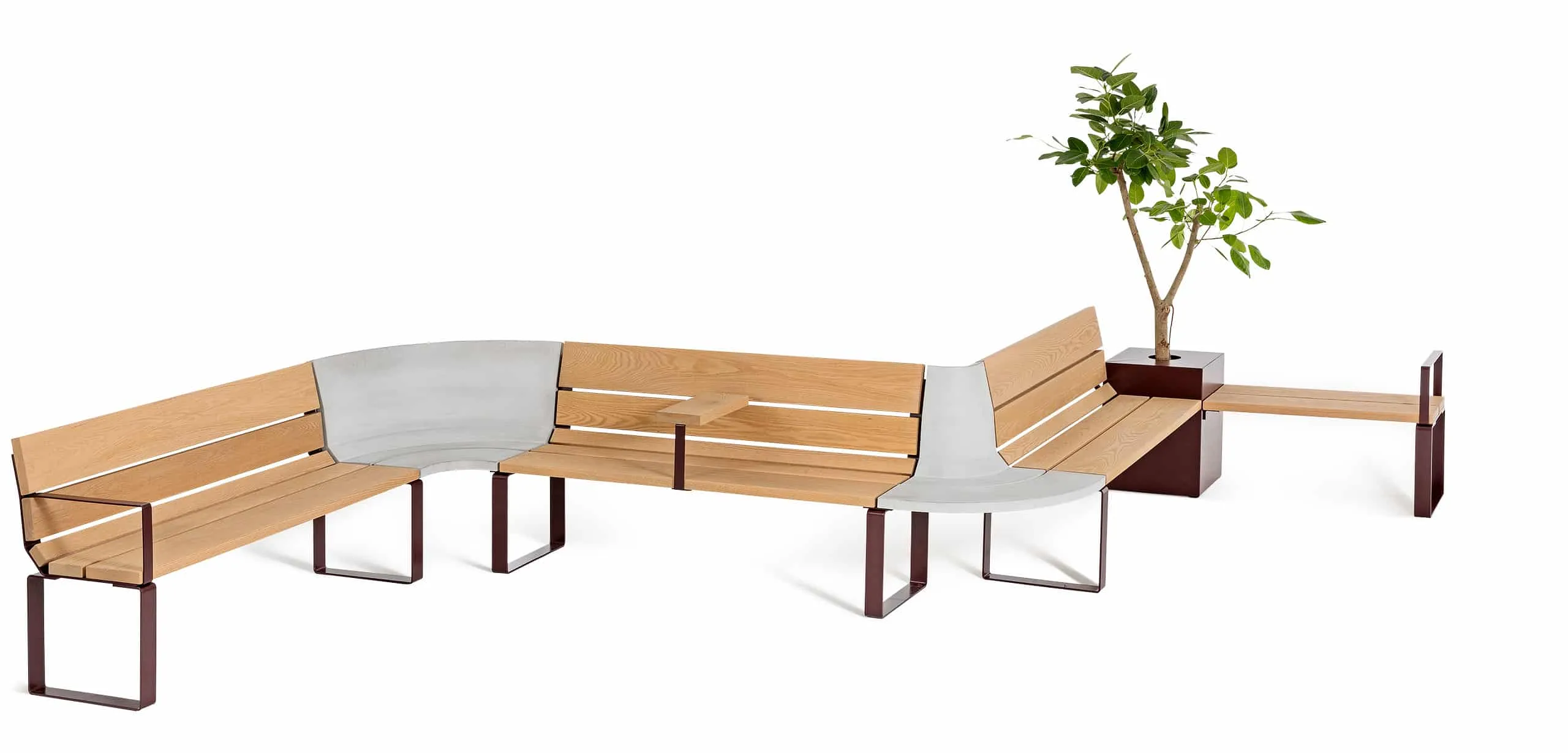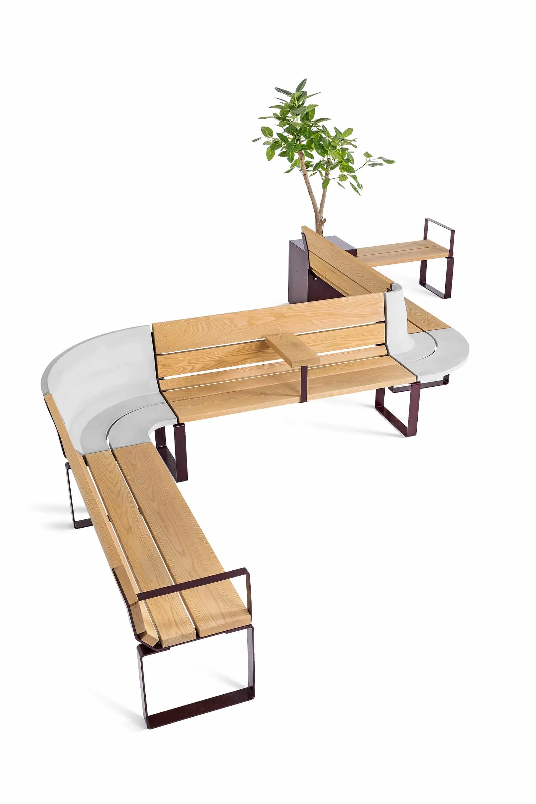 The system is comprised of freestanding components crafted from polished concrete supports and sleek lengths of sioo-treated oak. Central was conceived as a streamlined modular system that creates a wide range of forms and configurations. Curving components and linear modules interlock to create seating with backrests, tabletops and armrests, while optional planters slot into the system to add variety or designate individual areas. Its seat height, backrests and armrests have ergonomic proportions that accommodate a wide range of body types and levels of mobility. Central creates a one-of-a-kind seating to make any environment unique.