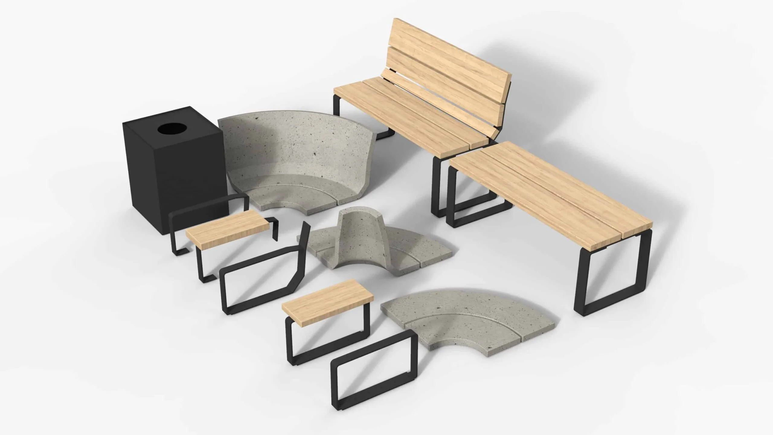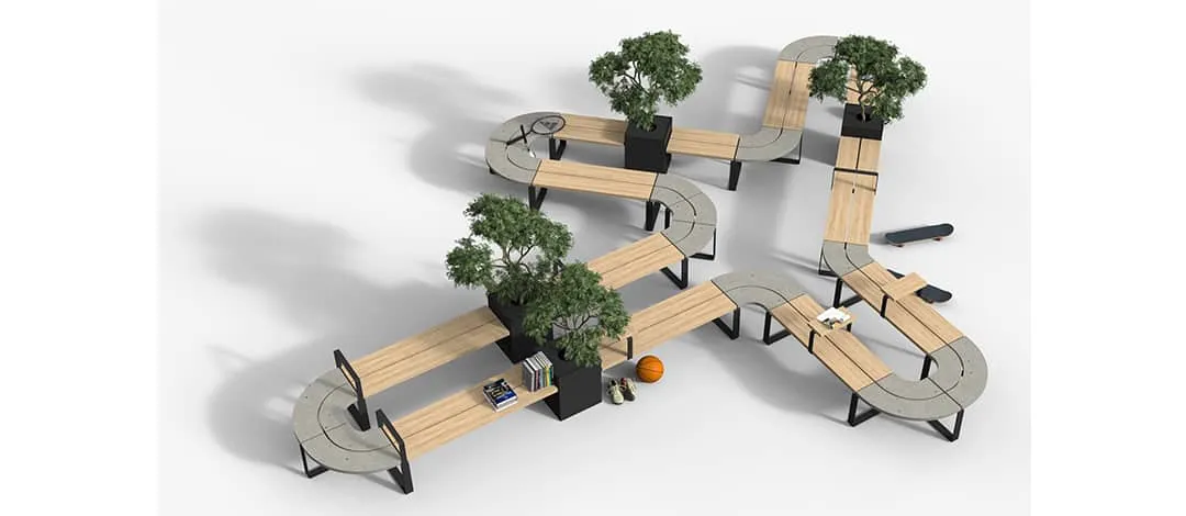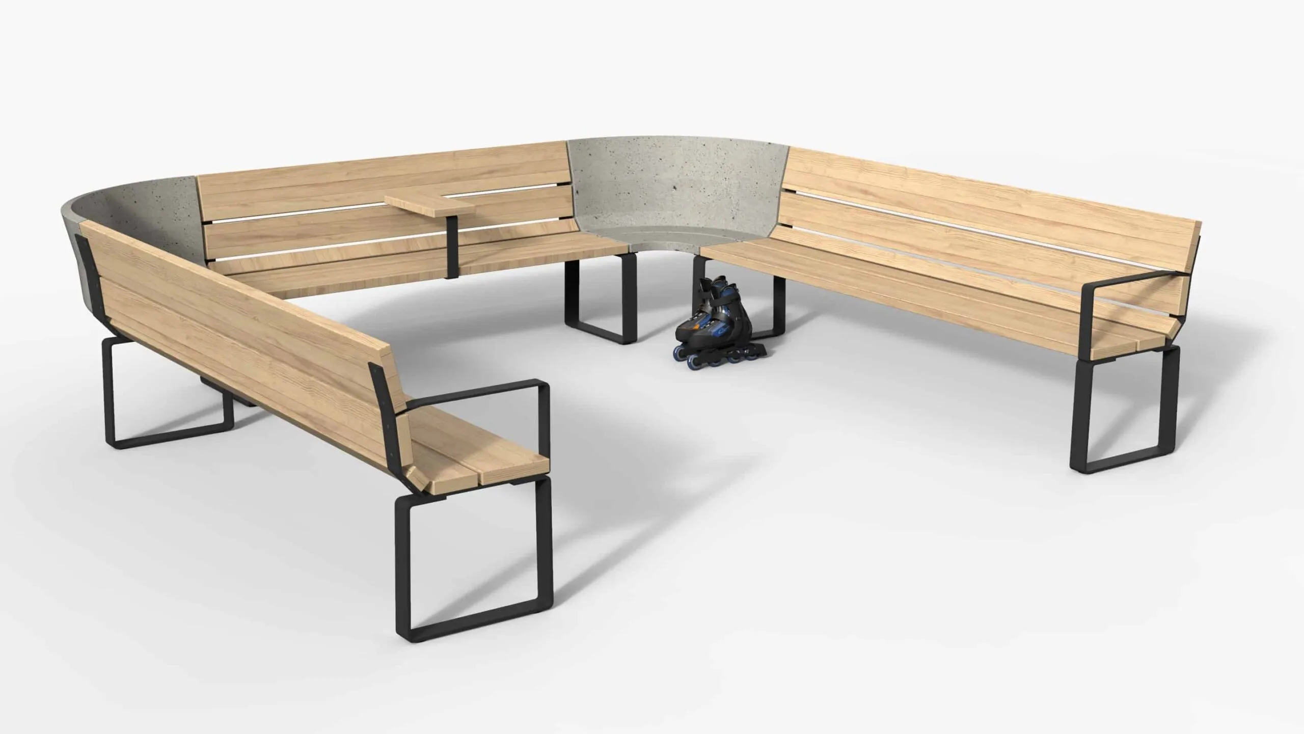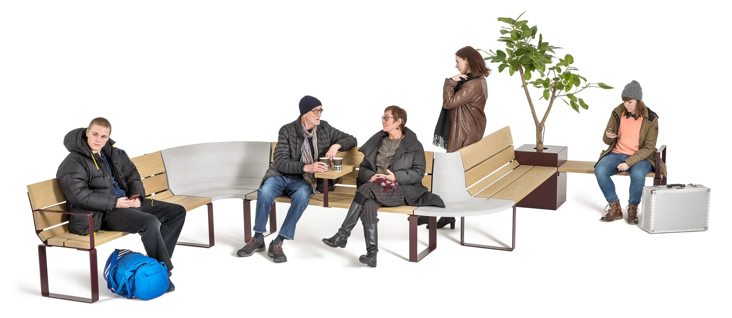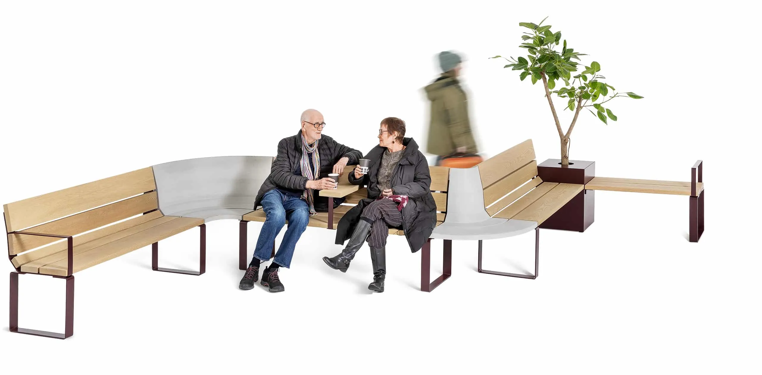 The system is comprised of freestanding components crafted from polished concrete supports and sleek lengths of sioo-treated oak. Central was conceived as a streamlined modular system that creates a wide range of forms and configurations. Curving components and linear modules interlock to create seating with backrests, tabletops and armrests, while optional planters slot into the system to add variety or designate individual areas. Its seat height, backrests and armrests have ergonomic proportions that accommodate a wide range of body types and levels of mobility. Central creates a one-of-a-kind seating to make any environment unique.