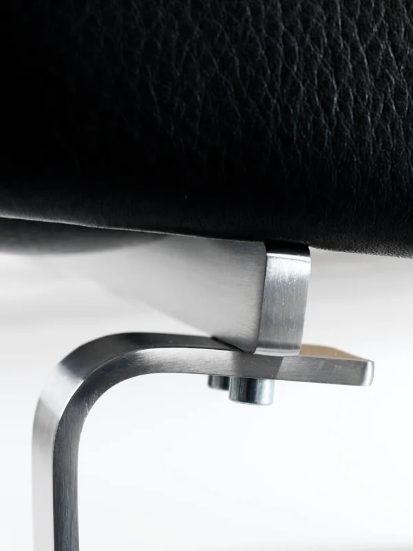 The stainless steel flat frame consists of a longitudinal rail which is joined to the leg with skids at each end. Stainless steel is also included in the arm rests where it both supports the armrests but also covers the upholstery in both the front and the back. This creates an exciting contrast to the upholstery.