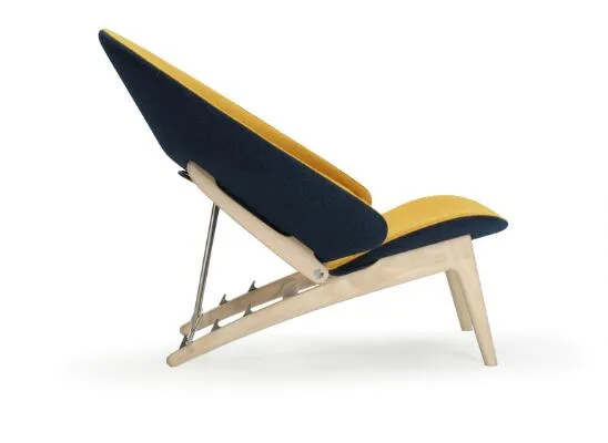 “Tub chair”. Unique easy chair with Danish ash frame, seat and shell-shaped adjustable back upholstered with yellow/blue Blans wool designed by Hanne Vedel. Movable steel bracket and fittings. Model PP 530. Made and stamped by PP Møbler in 2022.