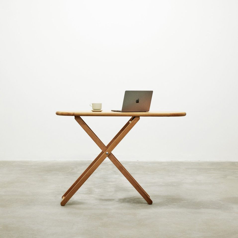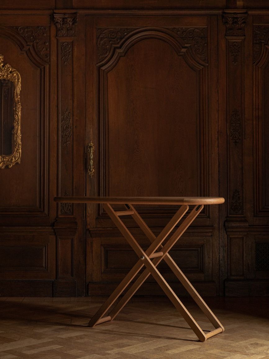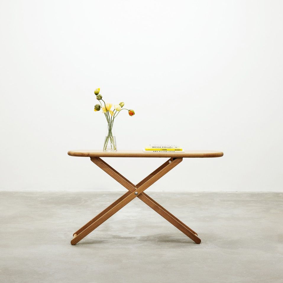 ‘Finally, an ironing board that breaks out of the closet! You can raise Cinderella up or down: place your laptop or tablet on it, fill it with beautiful things and flowers, or fold it together and let it rest by a wall. The oak has a fabulous smooth grain that will adorn any setting, private or public, and brings a new level of flexibility with it. A specially made heat-resistant textile will dress up the tabletop when household work is about.’