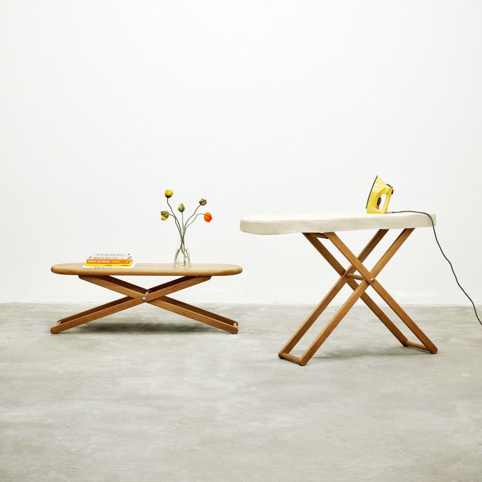 Anna Kraitz lets the ironing board of the closet to be transformed into a flexible multi-use furniture piece that will enrich any setting. Use it as nimble desk for the home office, or to show off precious acquisitions, or as a temporary bar. Raise it a notch to browse and write away on your laptop, or with an assortment of flowers. Or lower it to use as a stylish table by the sofa. Cinderella aspires to be so much more than an ironing board. With tough legs in smooth massive American oak, and an oak veneered tabletop, Cinderella stands firmly and will adapt to various uses, and of course to be at hand when ironing is about.