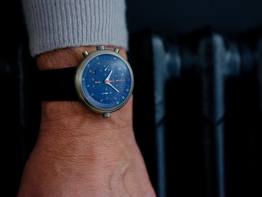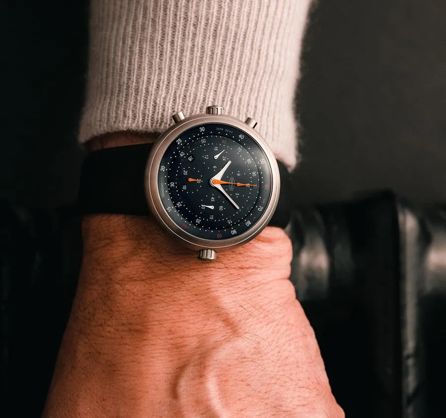 Skypod chronograph by Claesson Koivisto Rune featuring titanium case with aeronautical slide rule functionality