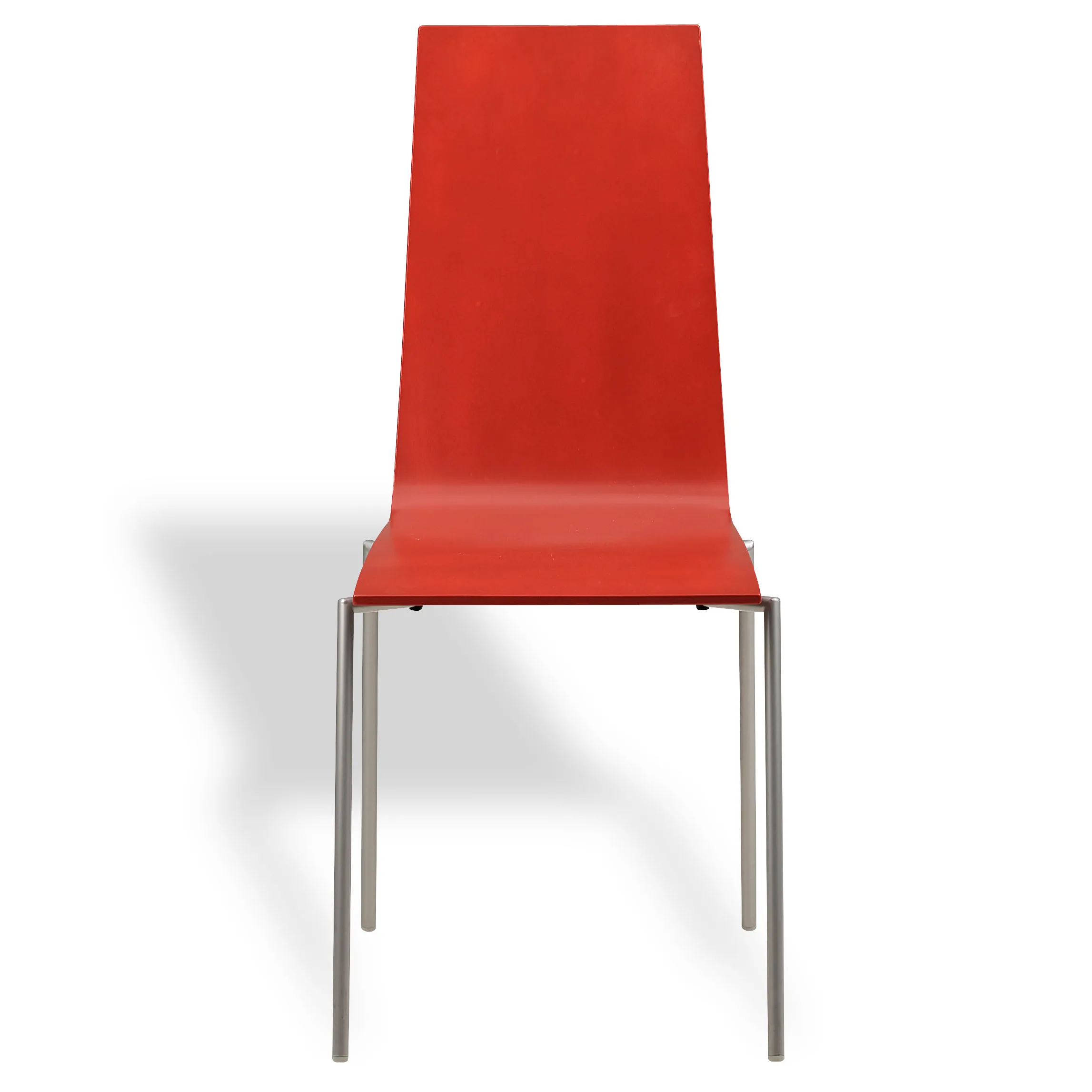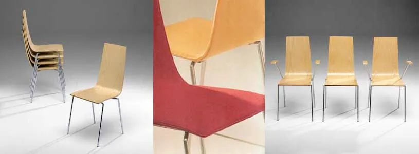 The distinctive angled steel frame in chrome supports seats crafted from natural birch or oak, available lacquered in standard colors or stained white and black. Revolutionary for its time, the Cobra Chair introduces stackable and linkable functionality without compromising aesthetic purity.