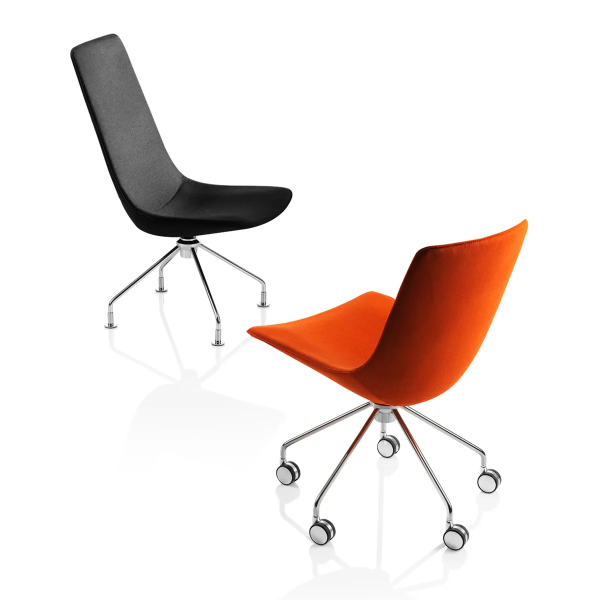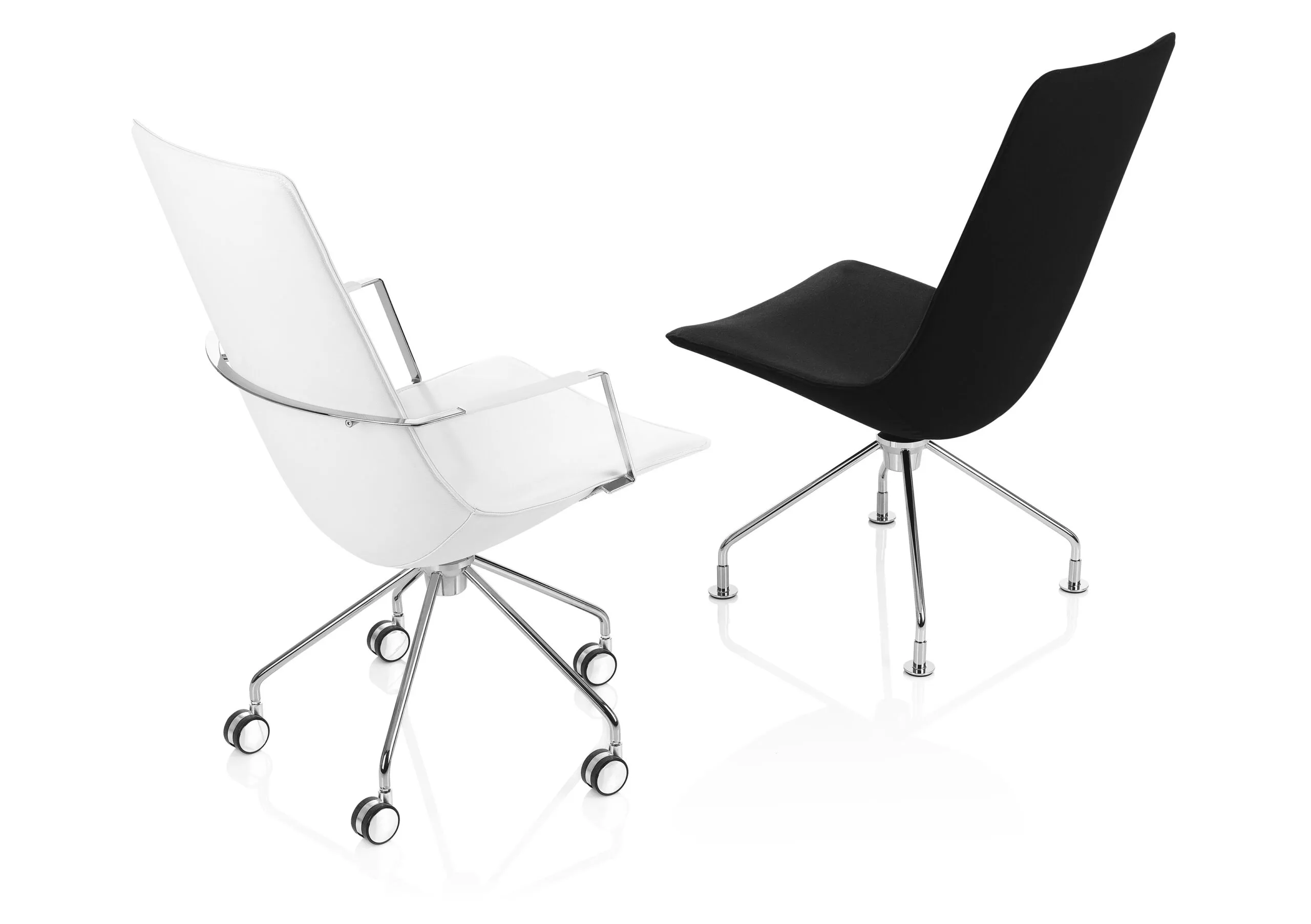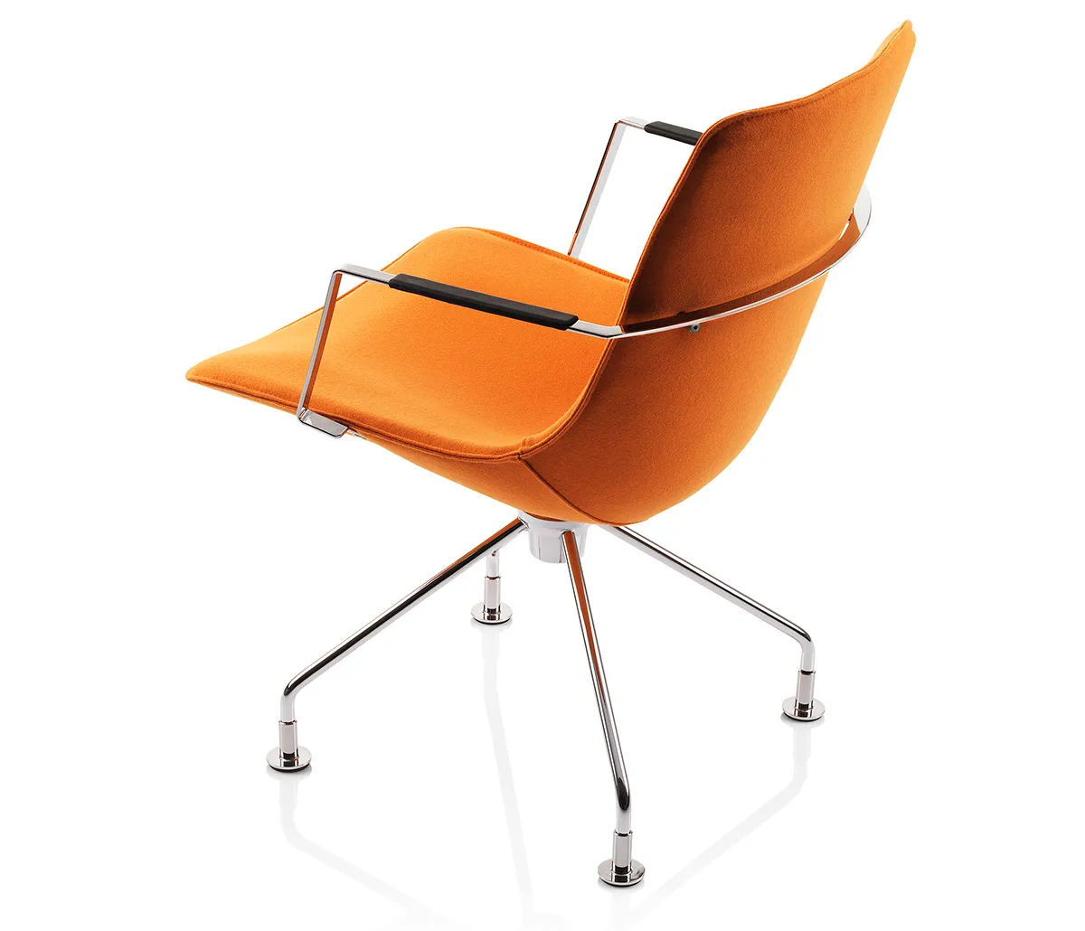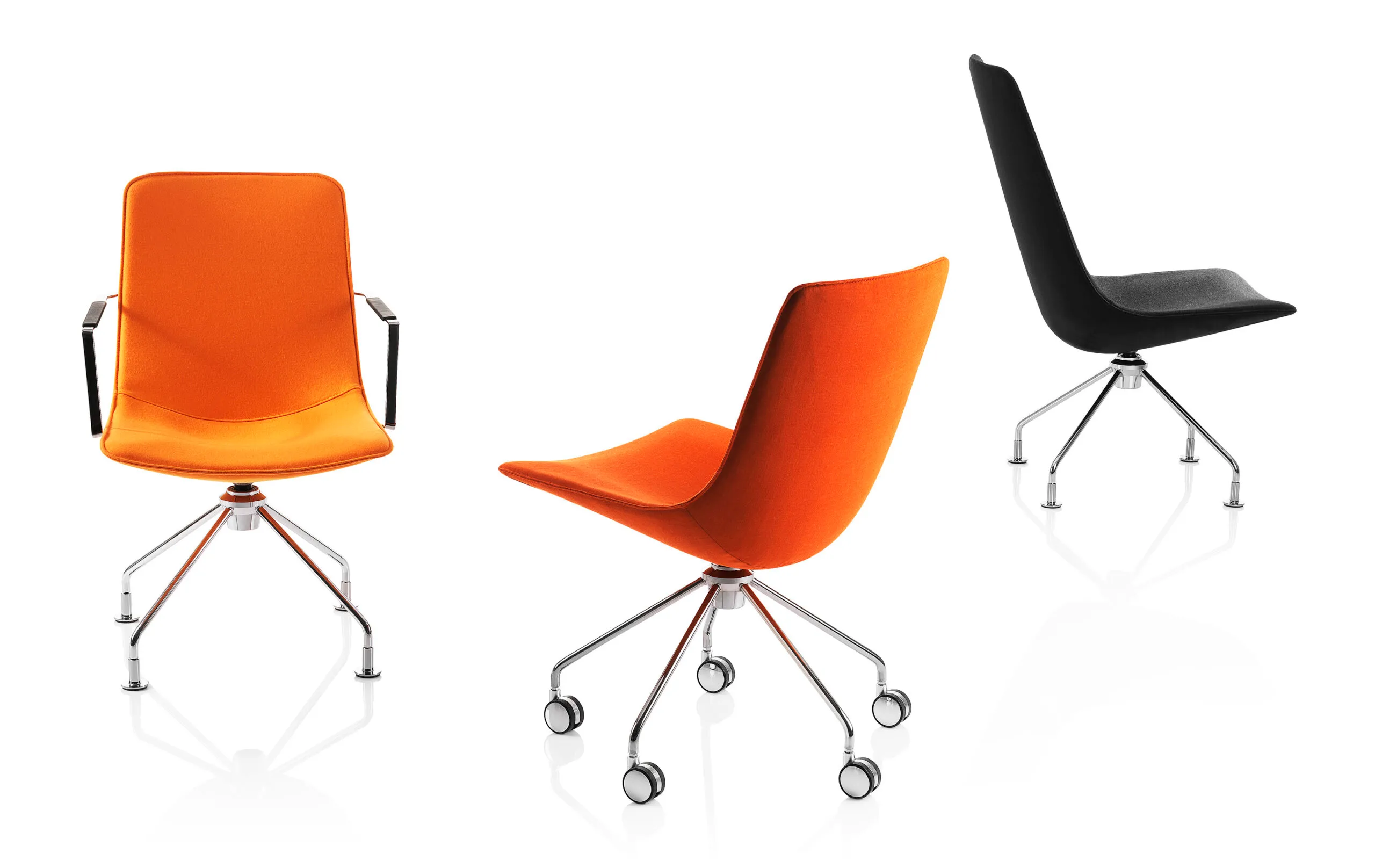 Comet is available with two base options: a four-leg swivel base with glides, and a five-star swivel base with casters. Both bases combine tubing of different diameter, with thicker tubing at floor level for the subtle suggestion of strength. Both frames are made of either powder coated or chromium plated steel tubing.