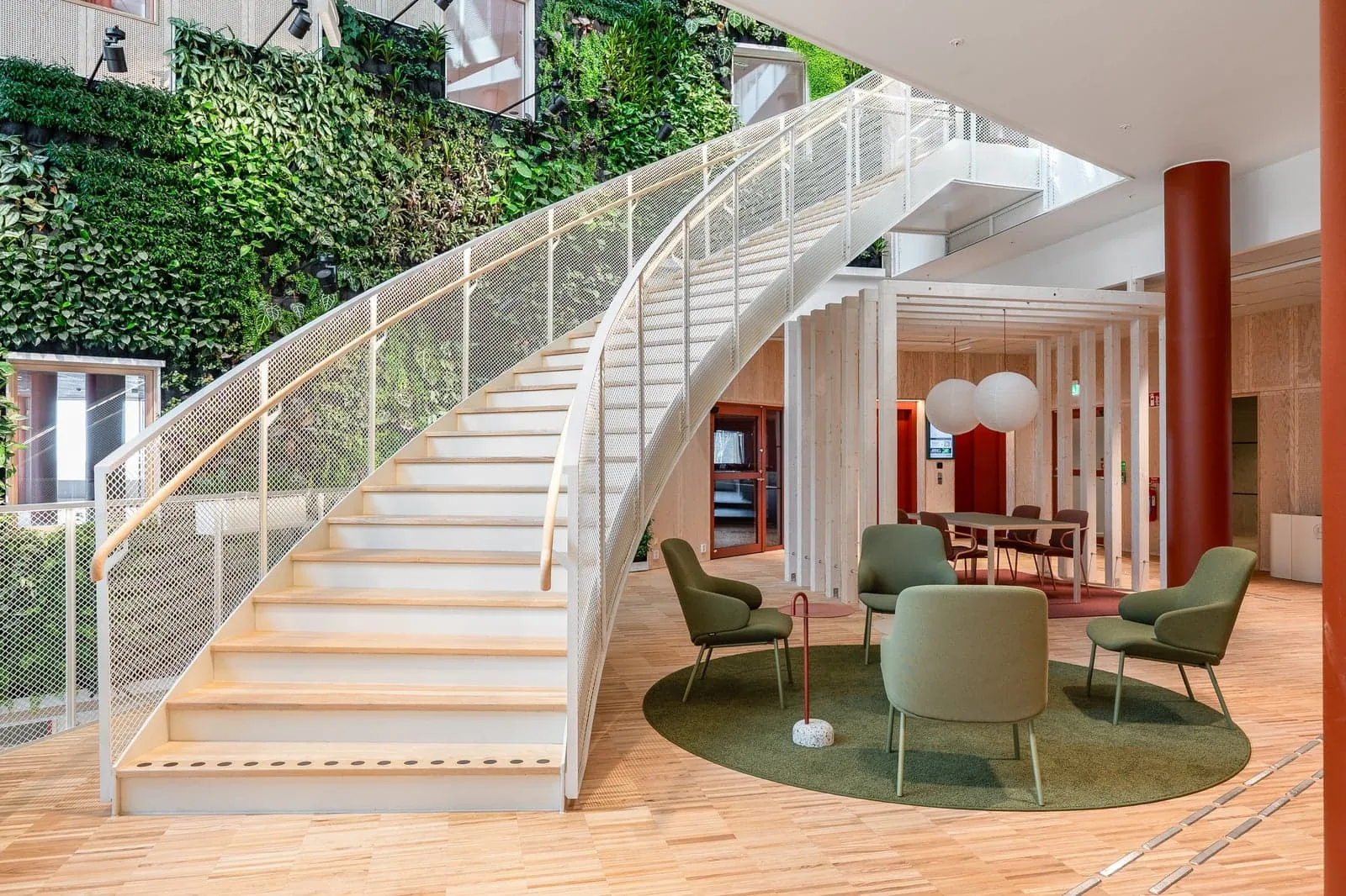 Hyllie Terrace atrium with interior design by Louise Hederström made from reused/recycled or discarded materials and furniture