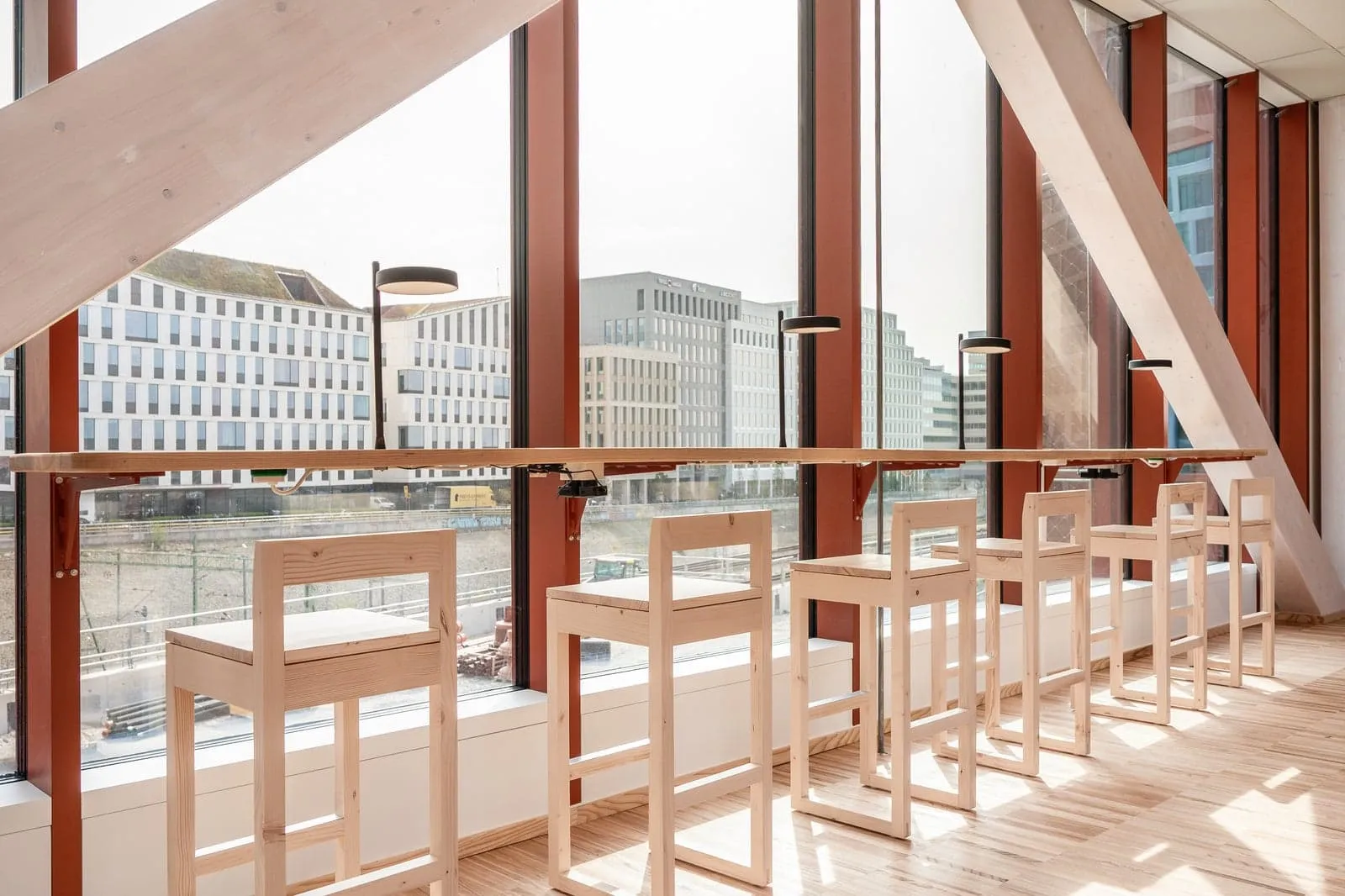 Spruce timber from the new buildings was cleaned of nails and concrete at Swedese’s Småland factory, then rebuilt into stylish bar stools. Rough CLT pieces from the neighboring Fyrtornet building were cut and sanded into benches with milled handles.