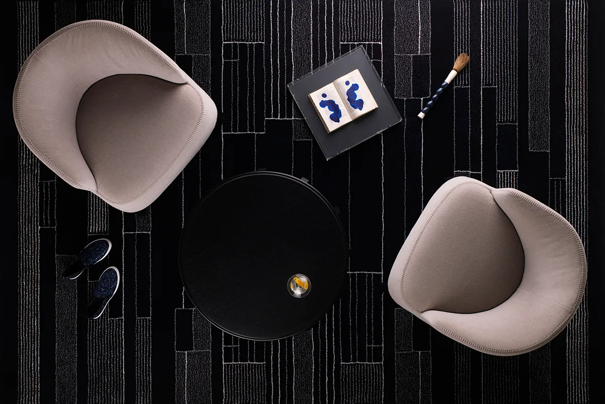 The room dedicated to the ‘50s, are furnished with the rug Airfield, a hand tufted reinterpretation of Astrid Sampe’s classic rug in wool and linen. The designer was on an airport when she got the inspiration to create the Airfield rug. The rug embodies the feel of an airport’s black asphalt, brown earth, puddles, and glittering rain along with the white-streaked brake tracks from the airplanes landing. The classic setting recalls, in terms of rigor and colors, the interiors of the architects of that period. Airfield is surrounded by furnishing designed in the 1950s: the LB7 bookcase by Franco Albini for Poggi, the Sleep-o-Matic sofa by Marco Zanuso that is illuminated by the VV Cinquanta floorlamp designed by Vittoriano Viganò, now remade by Astep, and a set of T8 coffee tables designed by Vico Magistretti.
