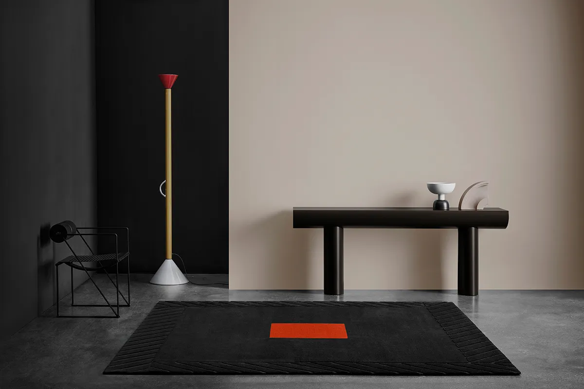 The last setting of the journey is the ‘80s. The room hosts a re-edition of a rugdesigned by Berit Woe, Square, produced in a 100% wool tufted version in the same colors as the original: a black frame with a bright red square in the center. The mise-en-scene reflects the graphic style of the rug, configuring itself as a sort of conceptual installation. A closed and dark space, where the rug is illuminated by the Shogun lamps by Mario Botta for Artemide flanked by a bench that recalls the colors of the carpet. Inevitable in the scenography is the homage to Memphis, the avant-garde phenomenon of those years.