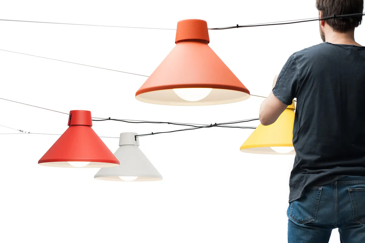 The Tokyo district of the same name inspired DAIKANYAMA; the pendant and cables create spatiality on a pleasant scale for both large and small areas. In zigzag, stricter or even slightly chaotic confi gurations between walls, ceilings and poles, with the electric cable running along the wire from one to the next. There are endless possibilities for this playful pendant with painted aluminium in standard colours: white, black, red, yellow and orange.