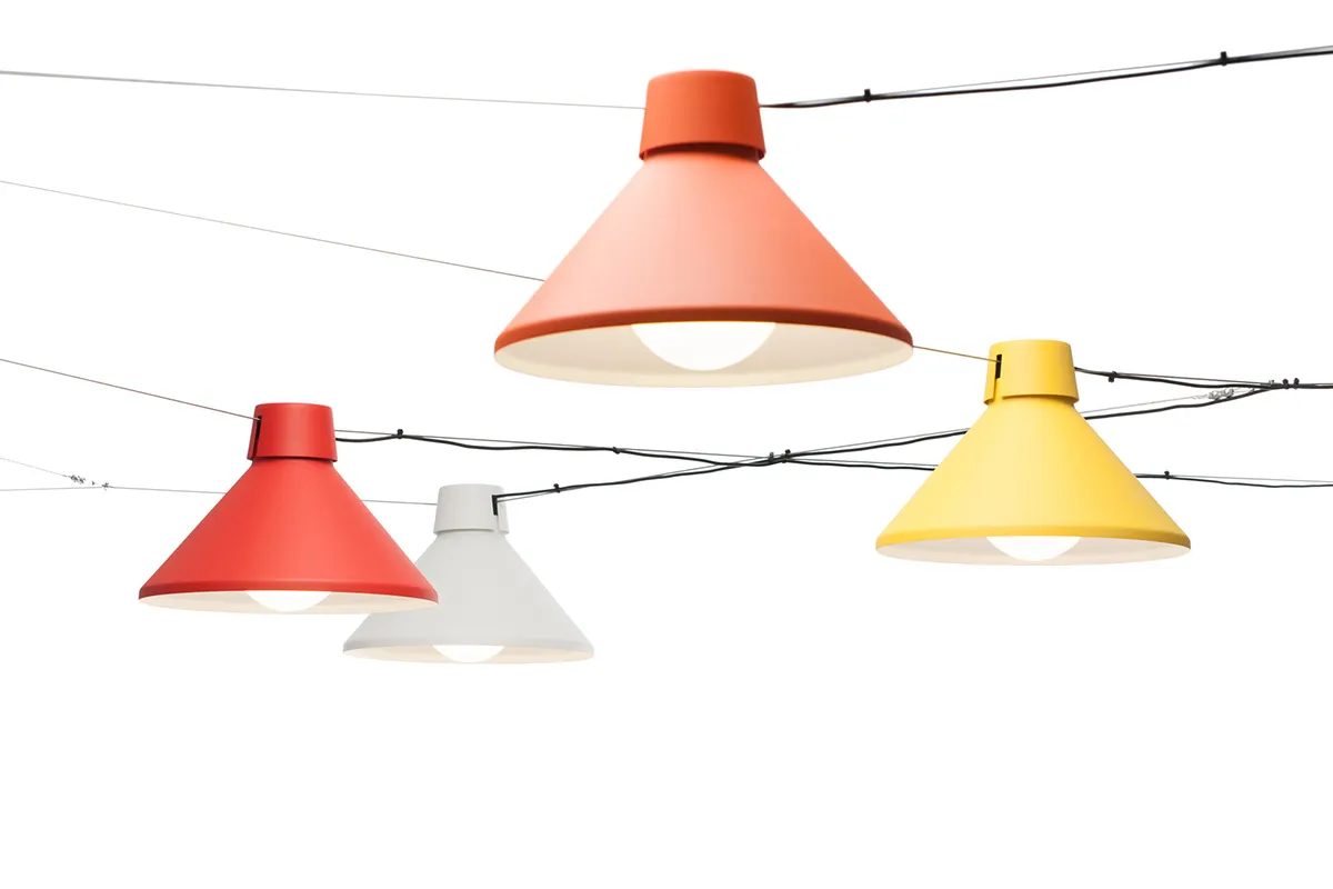 In zigzag, stricter or even slightly chaotic configurations between walls, ceilings and poles, with the electric cable running along the wire from one to the next. There are endless possibilities for this playful pendant.