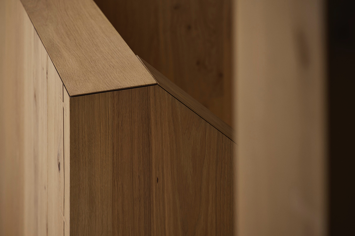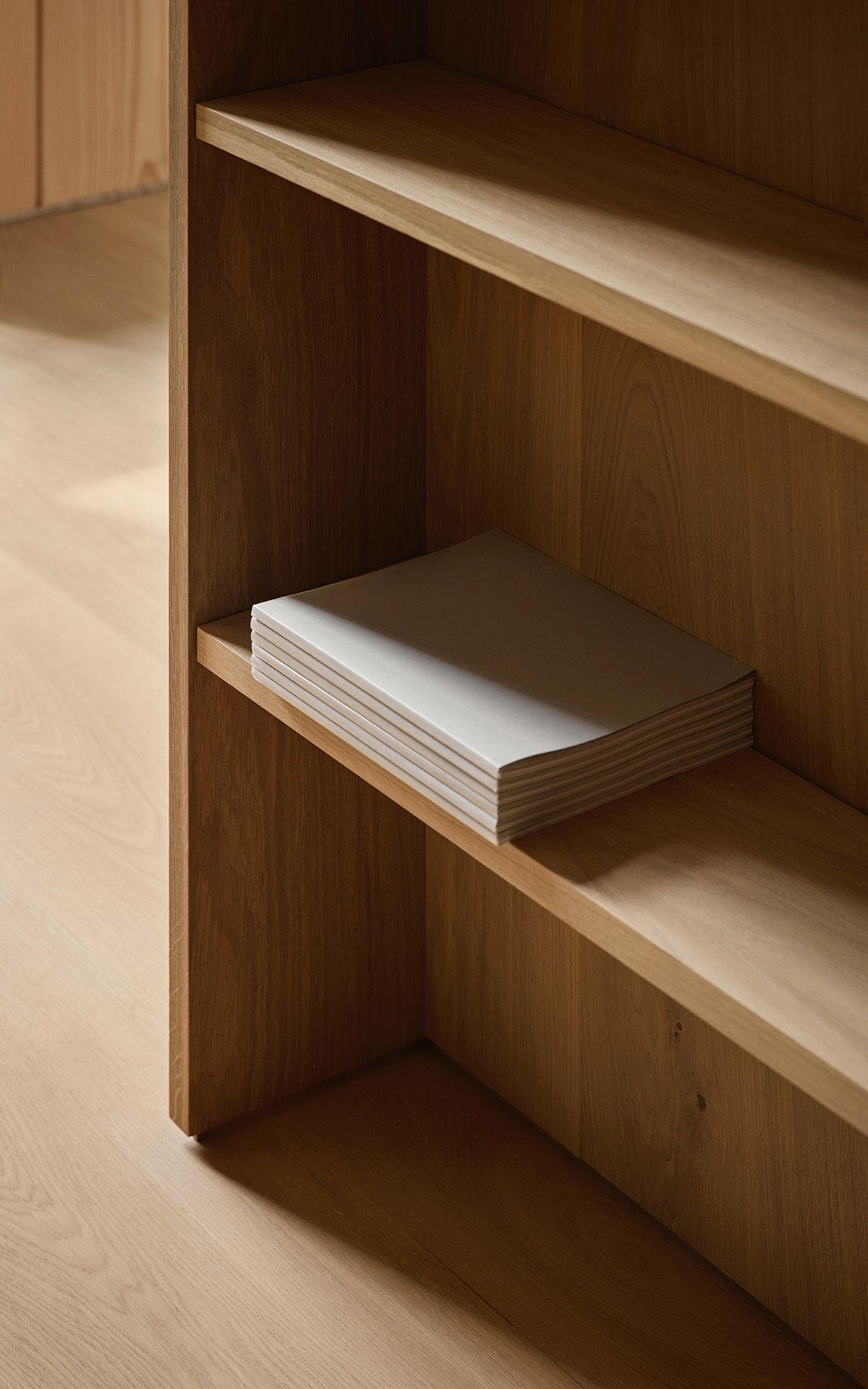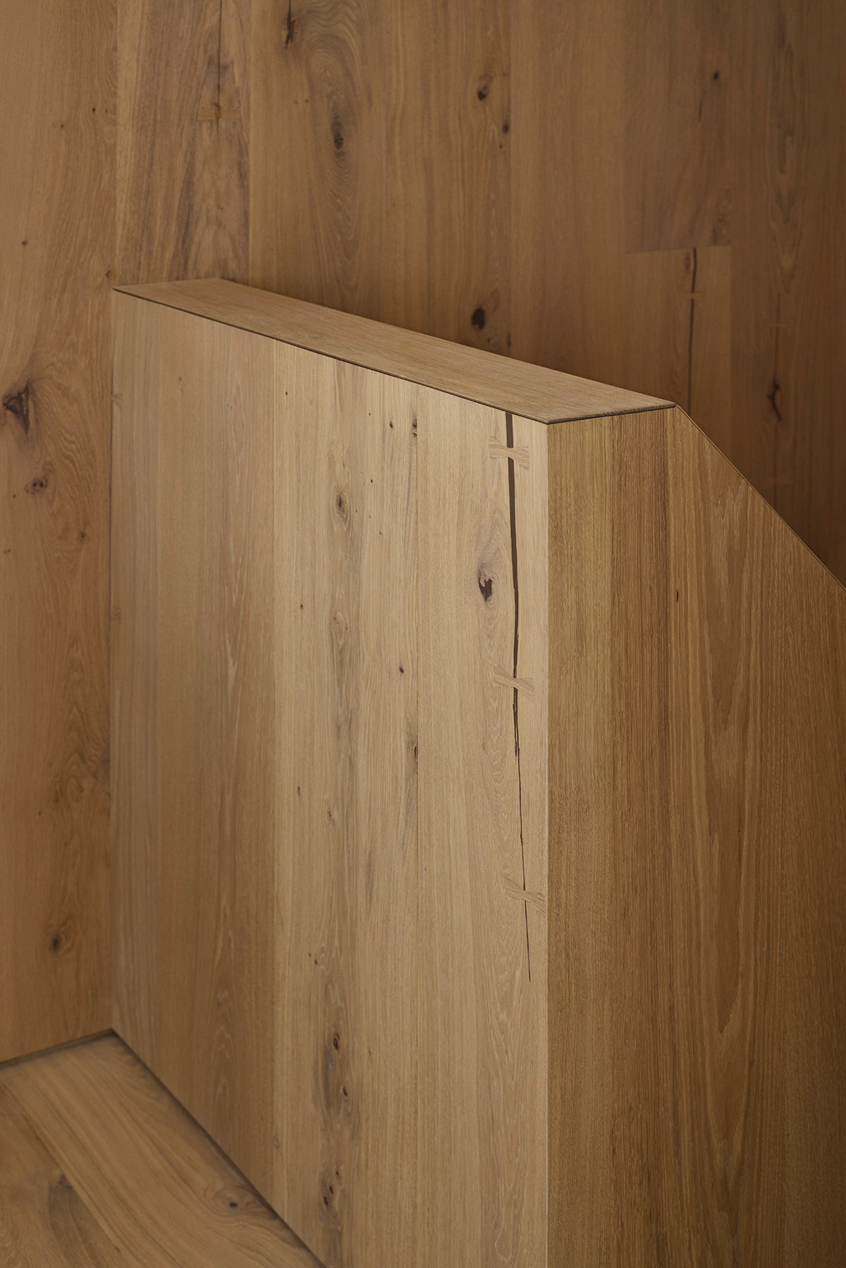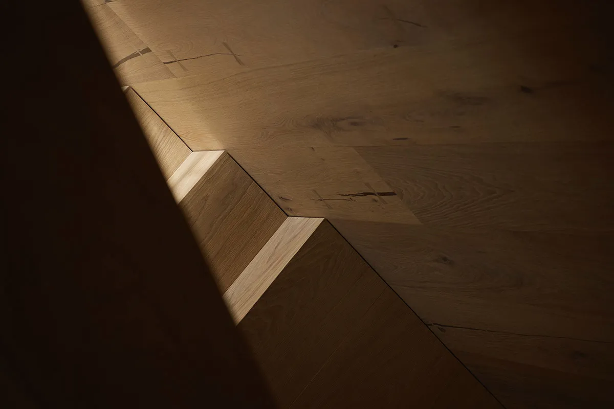 At the heart of the space is Dinesen Layers Oak in the Classic variant, chosen for its calm elegance and engineered stability. Seamless surfaces unify the interior, while select uses of Layers HeartOak add depth and character with natural cracks held by oak butterfly joints. The wood extends to cladding and a bespoke staircase in Layers Oak, a built-in bookcase in solid Oak Classic and a solid HeartOak headboard, creating a warm, continuous visual language.