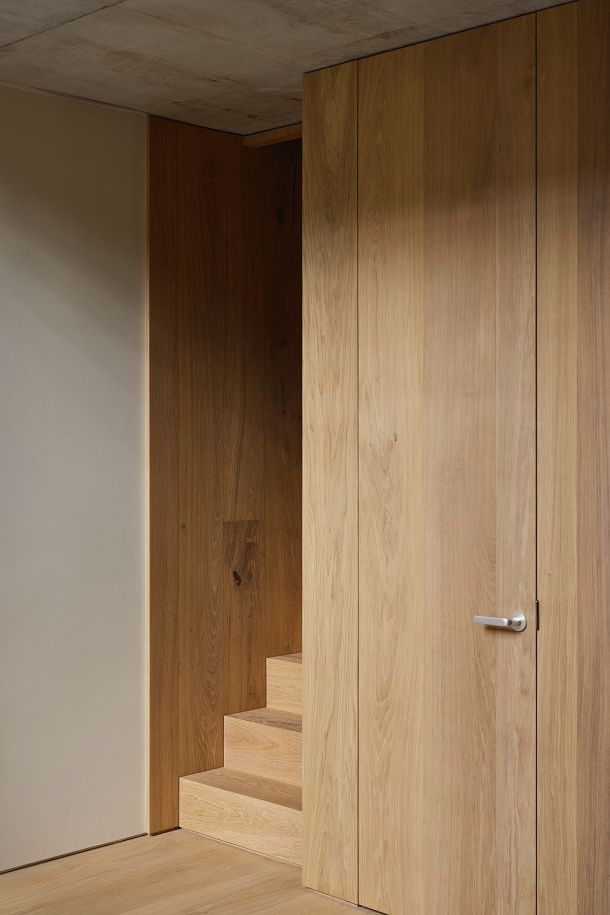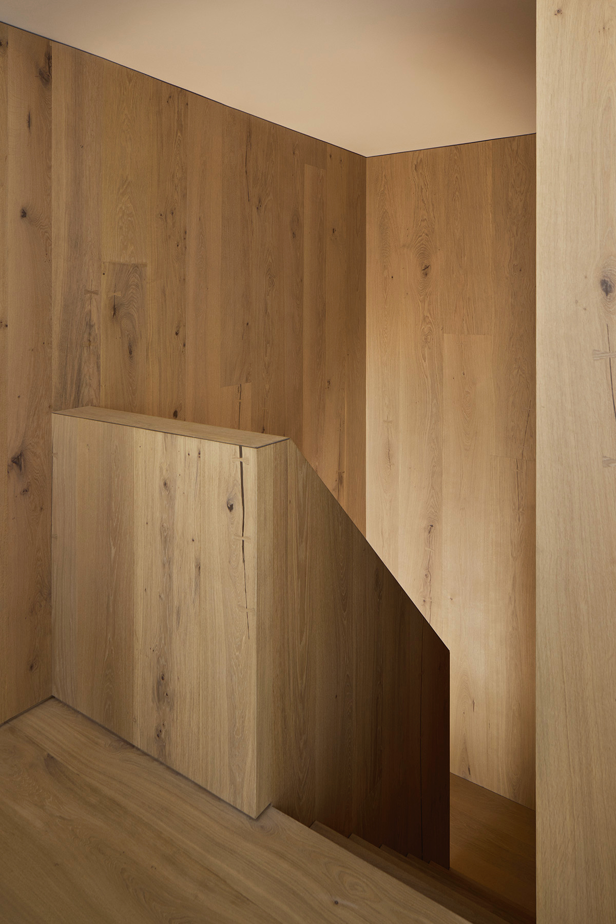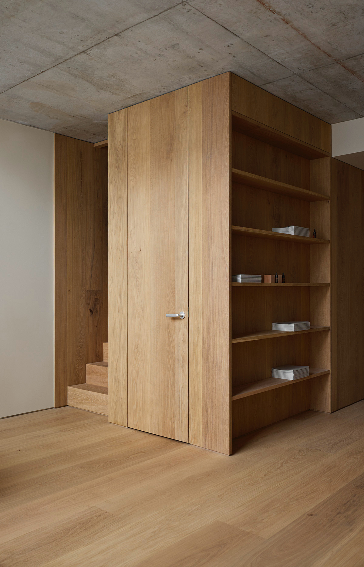 At the heart of the space is Dinesen Layers Oak in the Classic variant, chosen for its calm elegance and engineered stability. Seamless surfaces unify the interior, while select uses of Layers HeartOak add depth and character with natural cracks held by oak butterfly joints. The wood extends to cladding and a bespoke staircase in Layers Oak, a built-in bookcase in solid Oak Classic and a solid HeartOak headboard, creating a warm, continuous visual language.