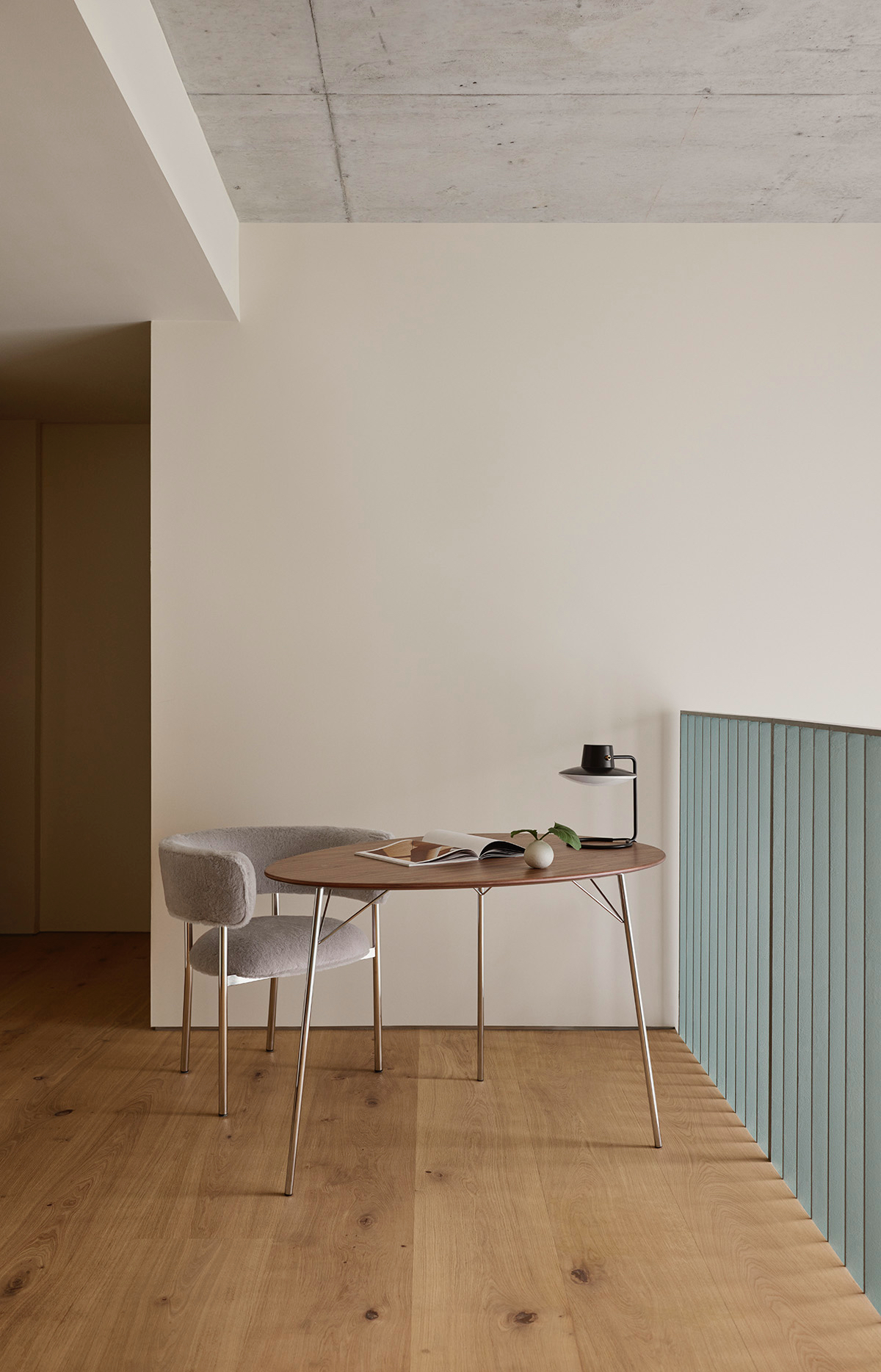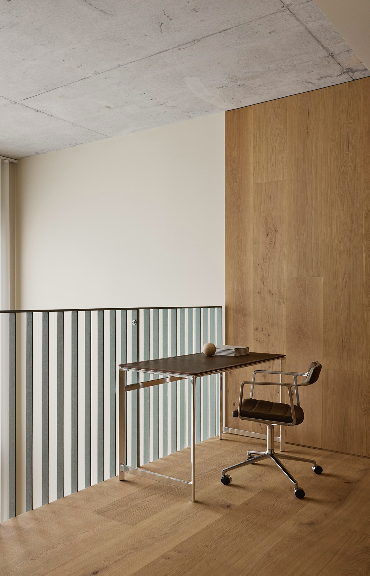 Every element of the apartment reflects Dinesen’s dedication to quality and craft. The Danish carpentry duo Ocular installed the flooring and carried out the meticulously crafted joinery details, from the half-turn staircase, wall-claddings and doors to the built-in furniture. Walls are painted in Titian, Sand and Suede, developed by David Thulstrup for Ble o. Their nuanced pigments complement the warmth of the wood and the natural light. Softness and texture are thoughtfully layered throughout the apartment, with rugs, drapery, upholstery, bedwear, blankets, towels and bathmats from Kvadrat, Sahco and Magniberg.