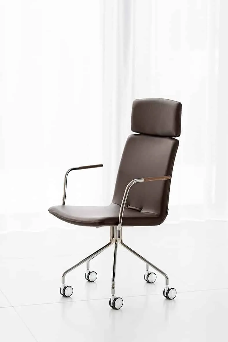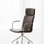 Day High is a fully upholstered conference chair with high back in fabric or leather. Armrests in ash, birch, oak or walnut, alternatively stained. Strip on the back available in different colours or quality. Interchangeable upholstery. Swivel star base in chrome plate or alternatively white-, black- or silver-lacquered steel tubing. Adjustable height. Guides or casters.