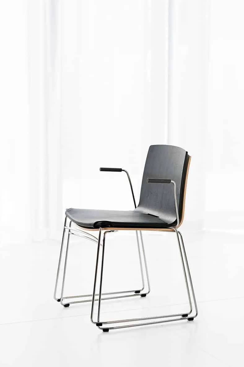 Day Lite is an auditorium chair, in fabric or leather, on runners, connectable and stackable. With or without armrests. Armrests enable hanging.