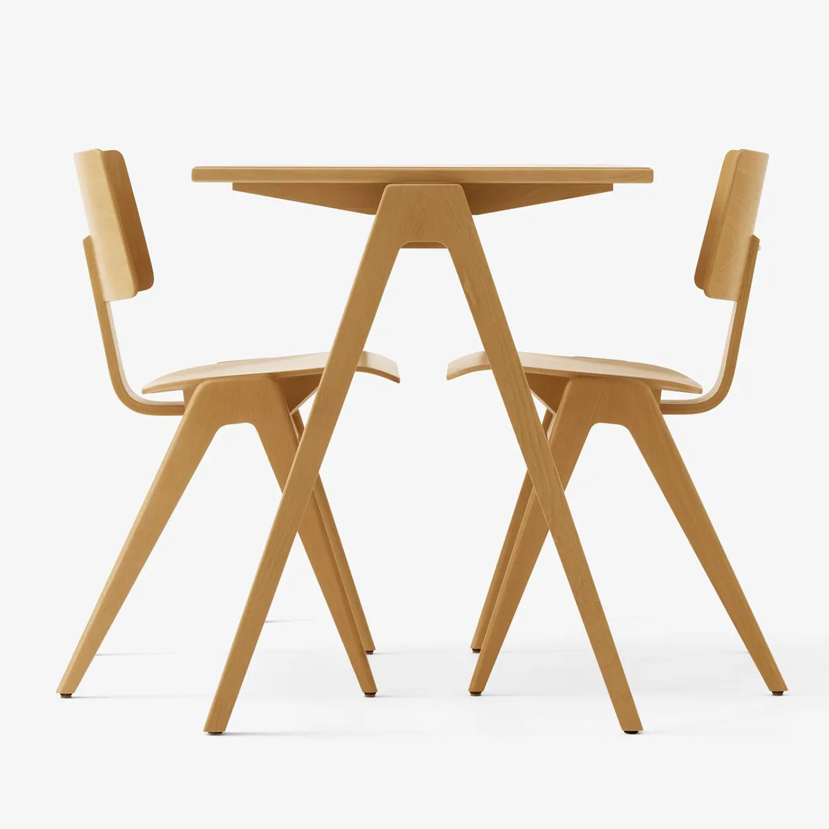 Today, the Daystak side chair is offered in two original versions: an all-beech variant, alongside a second variant which includes a beech frame with the addition of a walnut veneer applied to the front of the backrest and top seat for a dualtoned, contemporary aesthetic. The chair’s legs meet in the centre of the seat to create a striking A-formation – a defining feature which serves functionally as the pieces stack in numbers of up to 8. Both variants are made with a combination of wood veneer and solid wood legs.